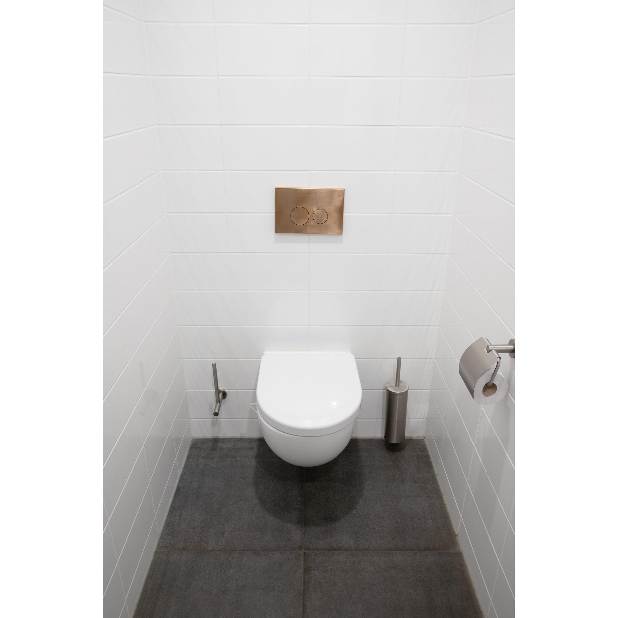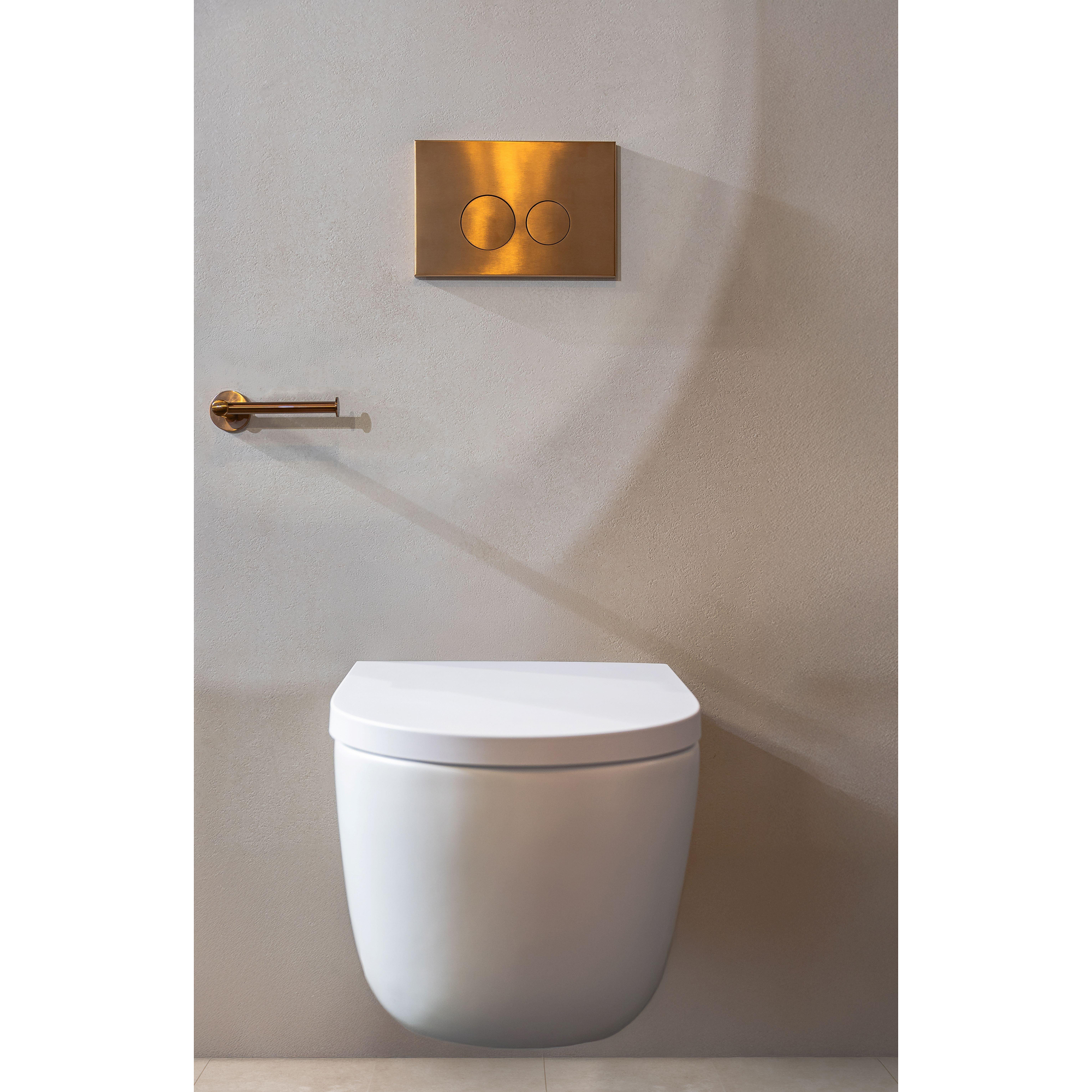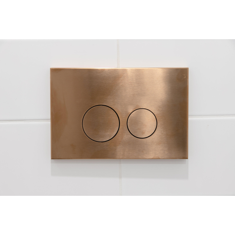 La plaque de commande QeramiQ Push Metal dégage style et élégance avec sa finition en métal cuivre et ses boutons ronds. Le design est intemporel et s'intègre parfaitement dans les salles de bains modernes. Le subtil éclat du métal ajoute une touche de luxe à l'espace, tandis que les boutons ergonomiques assurent une manipulation confortable. Cette plaque de commande est non seulement fonctionnelle, maar ook een decoratief element dat je badkamer naar een hoger niveau tilt.