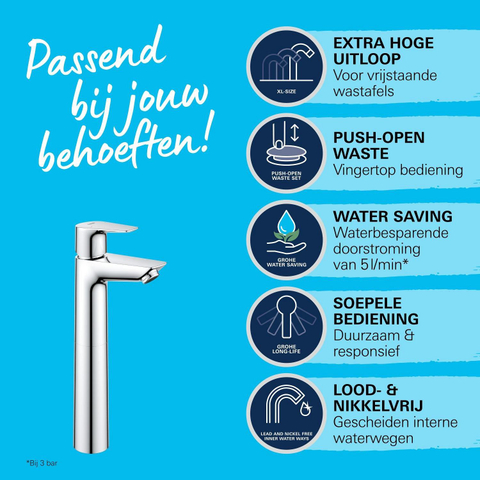Surprenamment facile ! Ce ensemble de robinet GROHE QuickFix Start Edge en format XL offre un confort d'utilisation supplémentaire, a fière allure en combinaison avec un lavabo et dispose de fonctionnalités écologiques – à un prix avantageux et rapide à installer