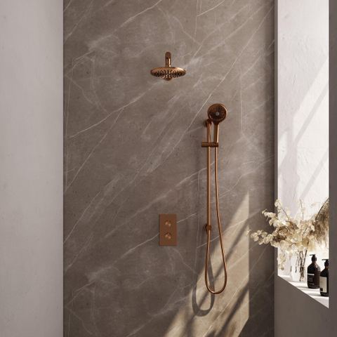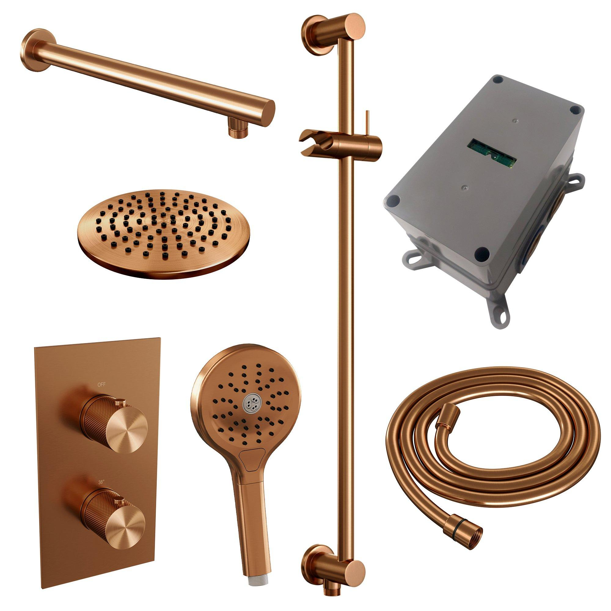Brauer Copper Carving Ensemble de douche de pluie encastré - pomme de tête 20cm - bouton carving - douchette ronde 3 jets - barre de douche - PVD - cuivre brossé
