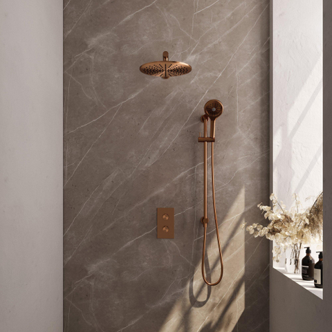 Ensemble de douche pluie encastré Brauer Copper Carving - douche principale 30 cm - bouton carving - douchette ronde 3 positions - glissière - PVD - cuivre brossé