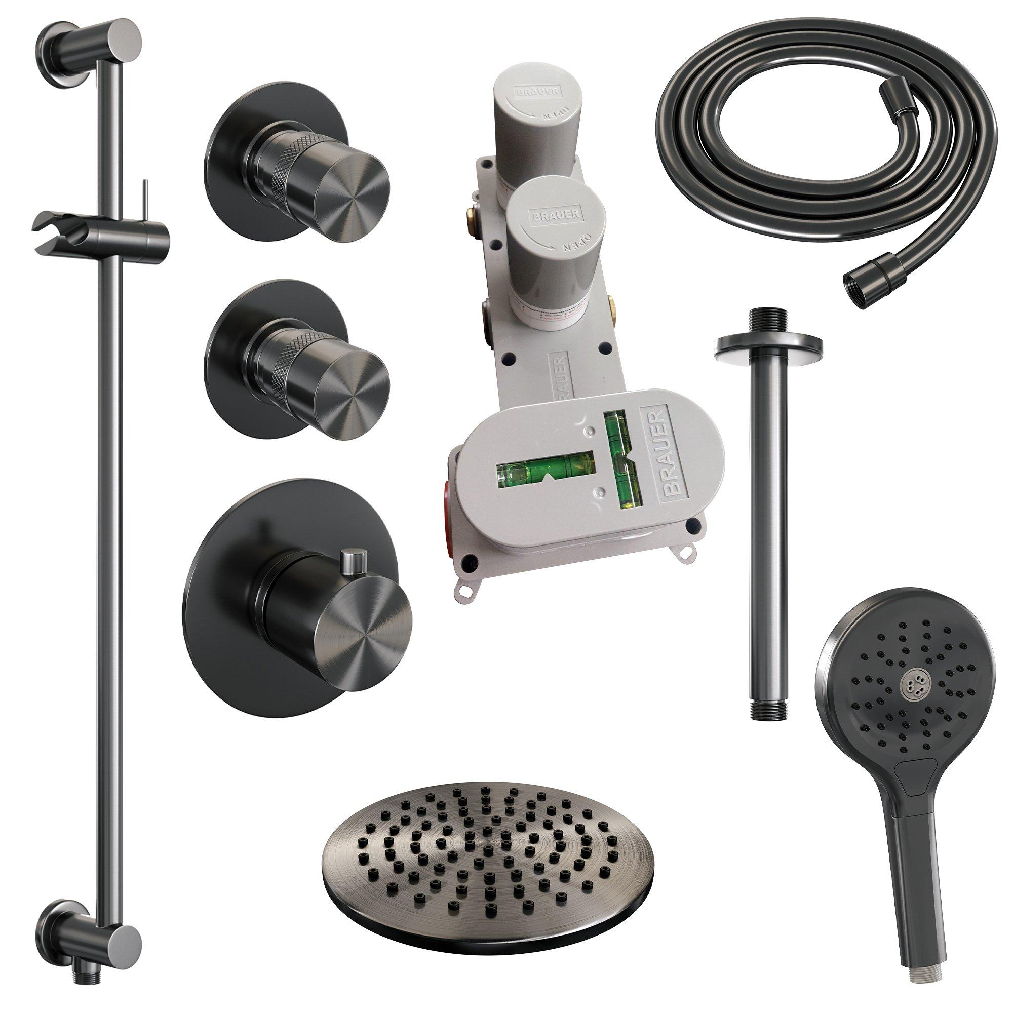 Brauer Gunmetal Edition Ensemble de douche pluie encastré - douche principale 20cm - bras plafond 20cm - 3 boutons lisses - douchette ronde 3 positions - PVD - gunmetal brossé