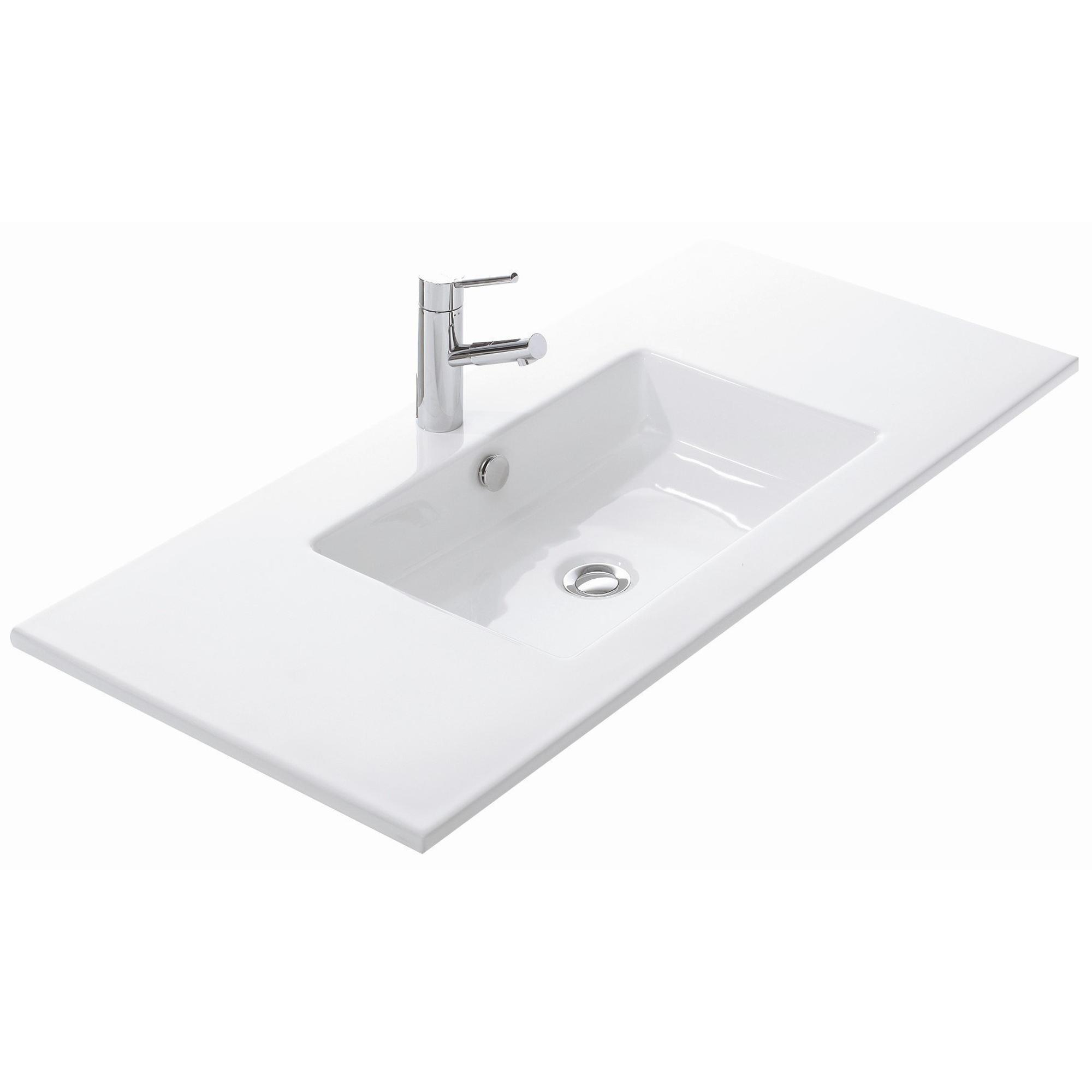 - Plan de lavabo céramique fin d’environ 101 cm de large et 46 cm de profondeur, idéal pour les salles de bains de taille moyenne.