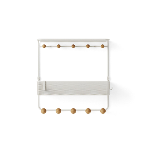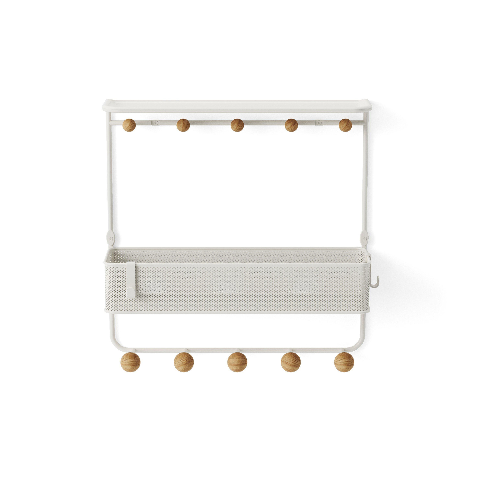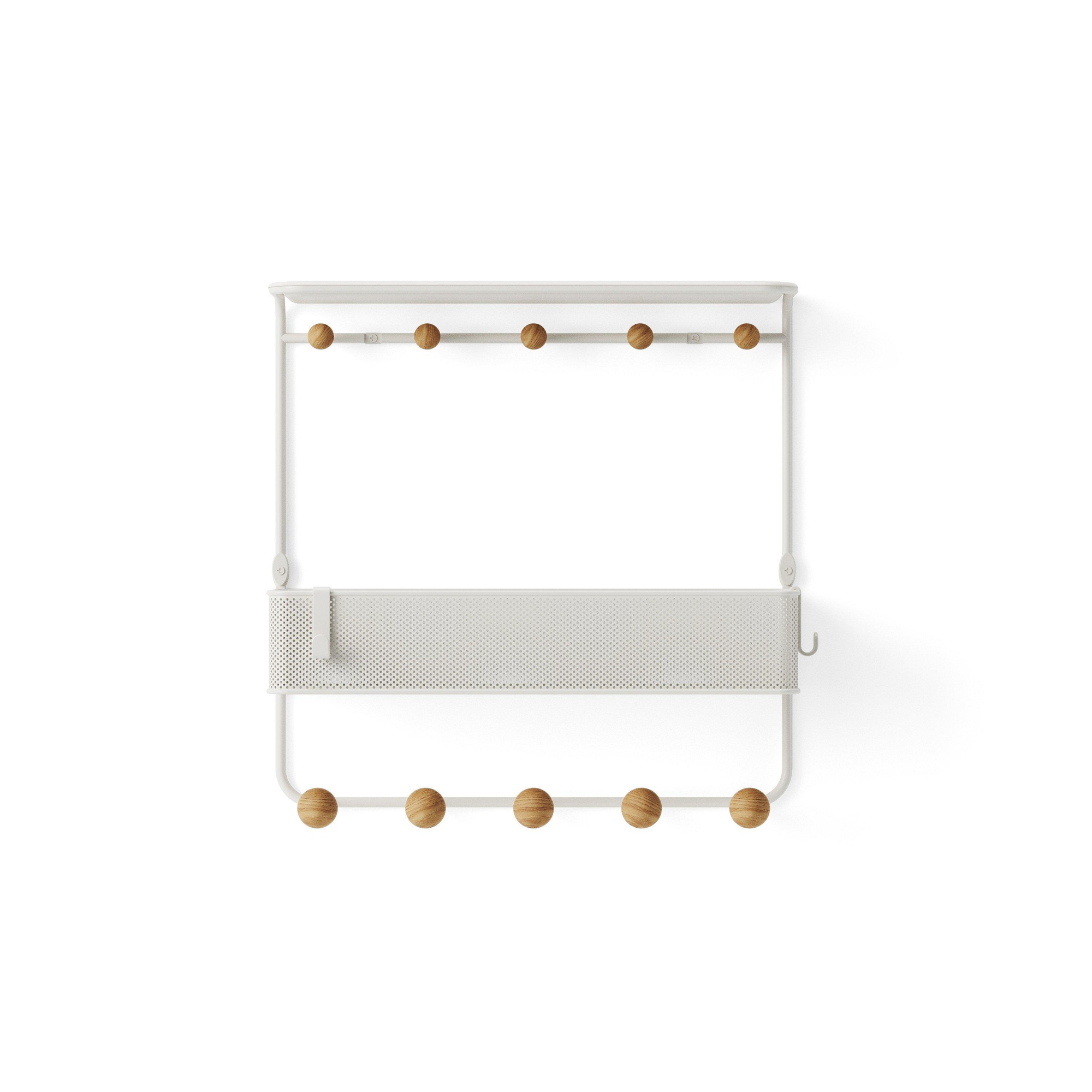 Estique dispose d'un panier en métal perforé, de 10 crochets avec des boutons en bois et d'un plateau intégré ; la capacité de charge maximale est de 18 kg