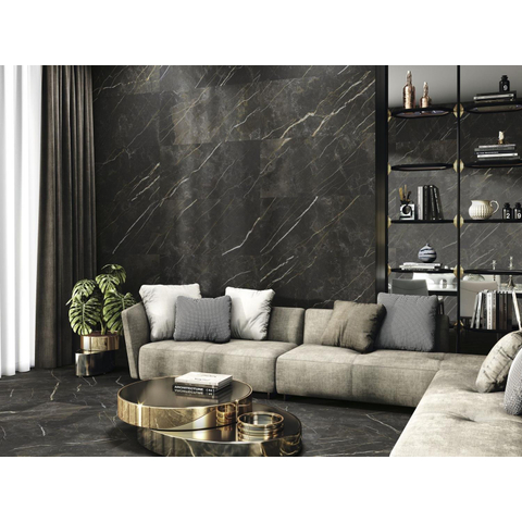 Ce carrelage dégage une majesté grâce à son grand format de 60x120cm. Le design carré et le noir profond brillant confèrent un sentiment de grandeur à chaque espace dans lequel il est utilisé. L’aspect marbre ajoute une touche de luxe, tandis que la finition rectifiée assure un ajustement parfait entre les carreaux, créant un aspect raffiné et royal.