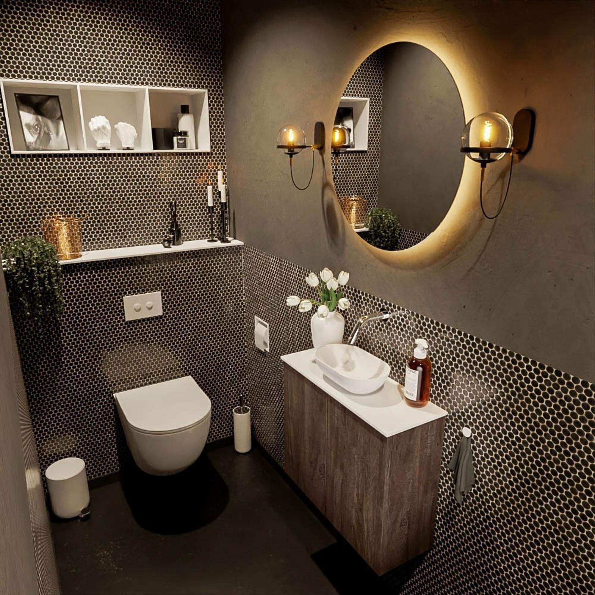 Vous cherchez un ajout élégant à votre salle de bain ? Le meuble de toilette Mondiaz Fowy est exactement ce dont vous avez besoin. Avec ses dimensions de 60x50x23cm et sa magnifique finition marron foncé mat, ce meuble dégage élégance et classe. Il n'a pas de trous de robinet, une lavabo au milieu, et 2 portes pour un espace de rangement suffisant. Fabriqué en matériau solid surface de haute qualité avec un plan en Melamine et un lavabo blanc, ce meuble de toilette est non seulement beau, mais aussi durable et fonctionnel.