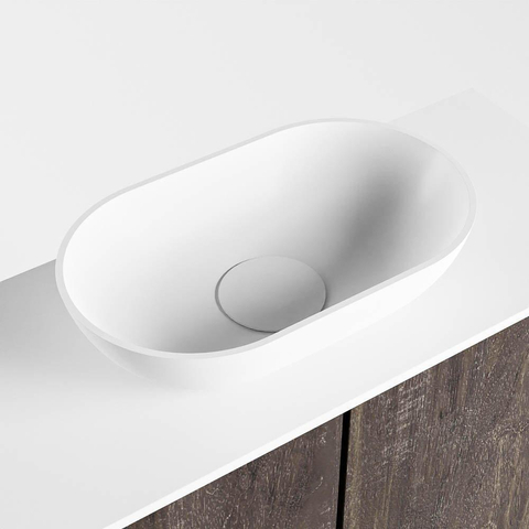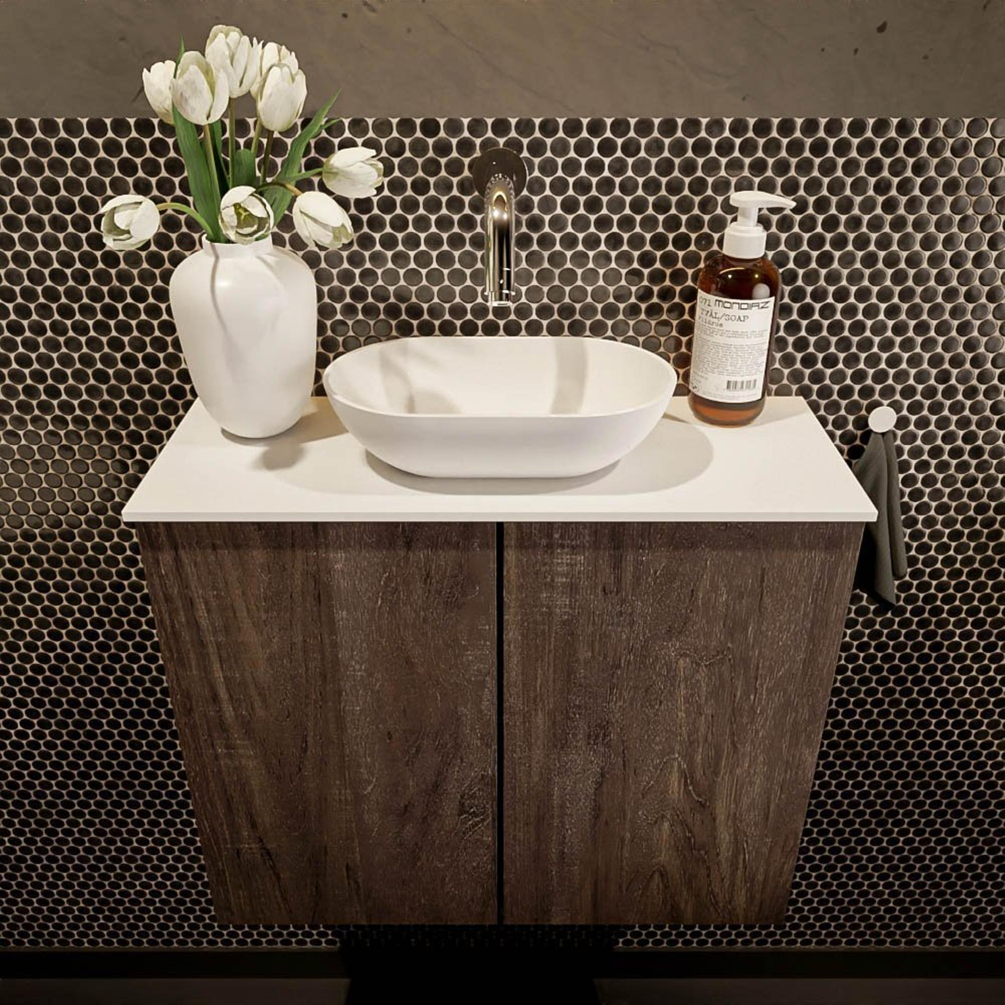 Mondiaz Fowy Meuble de toilette - 60x50x23cm - marron foncé mat - 0 trou de robinet - lavabo au milieu - 2 portes - solid surface - plan Melamine - lavabo: blanc