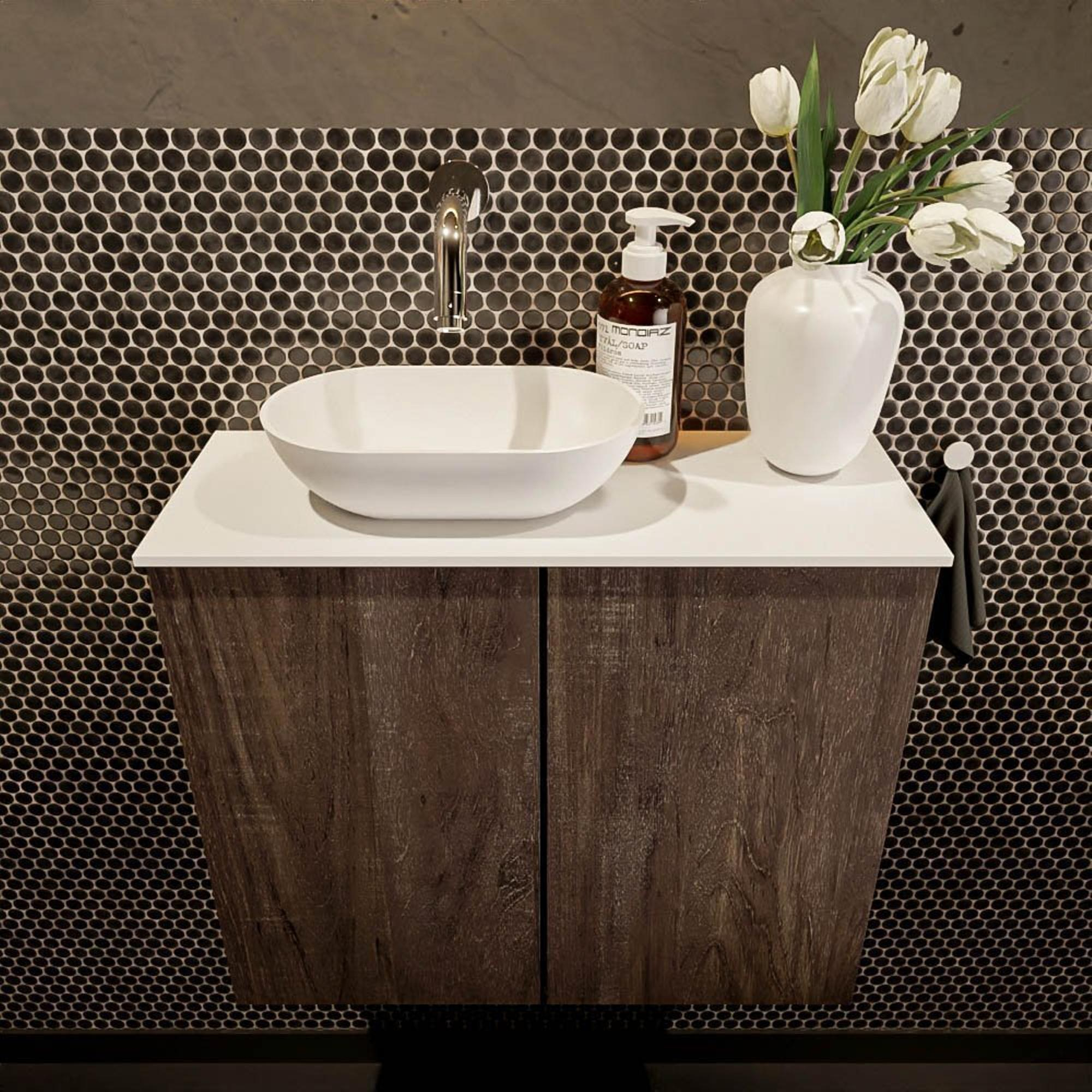 Meuble de toilette Mondiaz Fowy 60x50x23cm marron foncé mat 0 trou de robinet lavabo : gauche 2 portes solid surface avec plan Melamine couleur lavabo : blanc