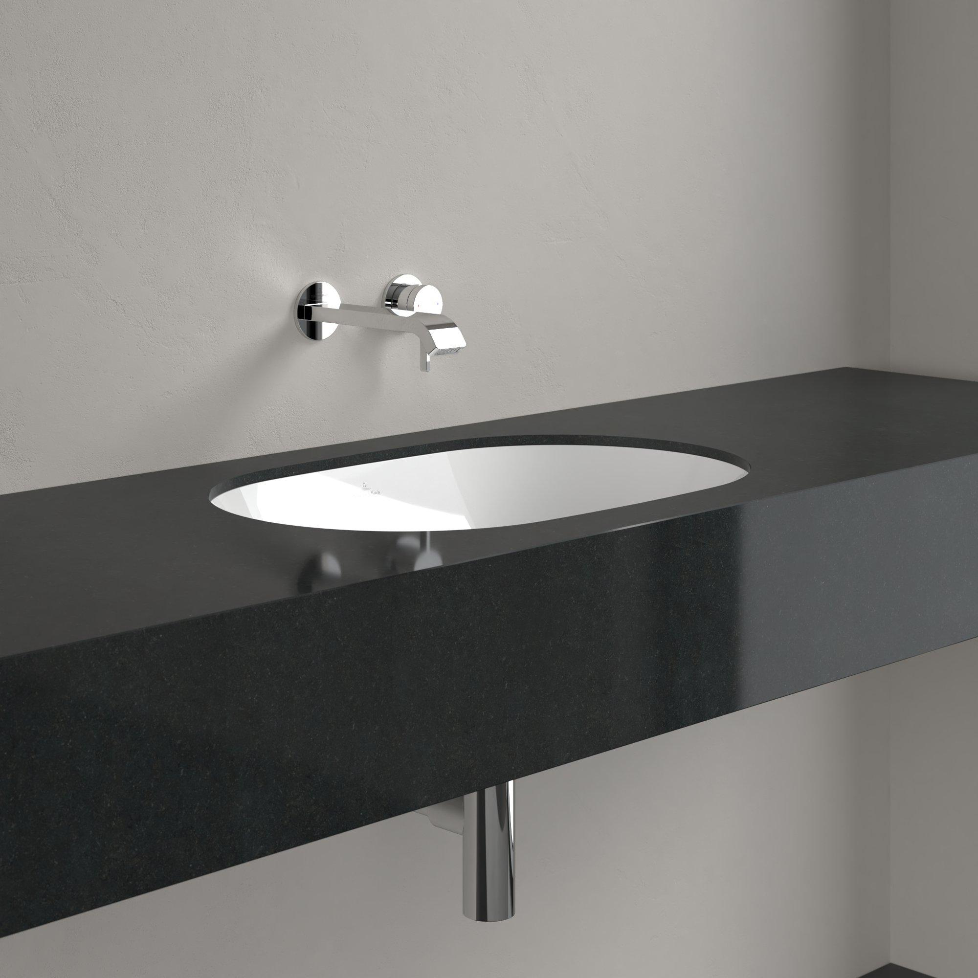 - Lavabo ovale encastré sous plan pour une apparence discrète et minimaliste en combinaison avec un plan de lavabo ou un meuble de salle de bains