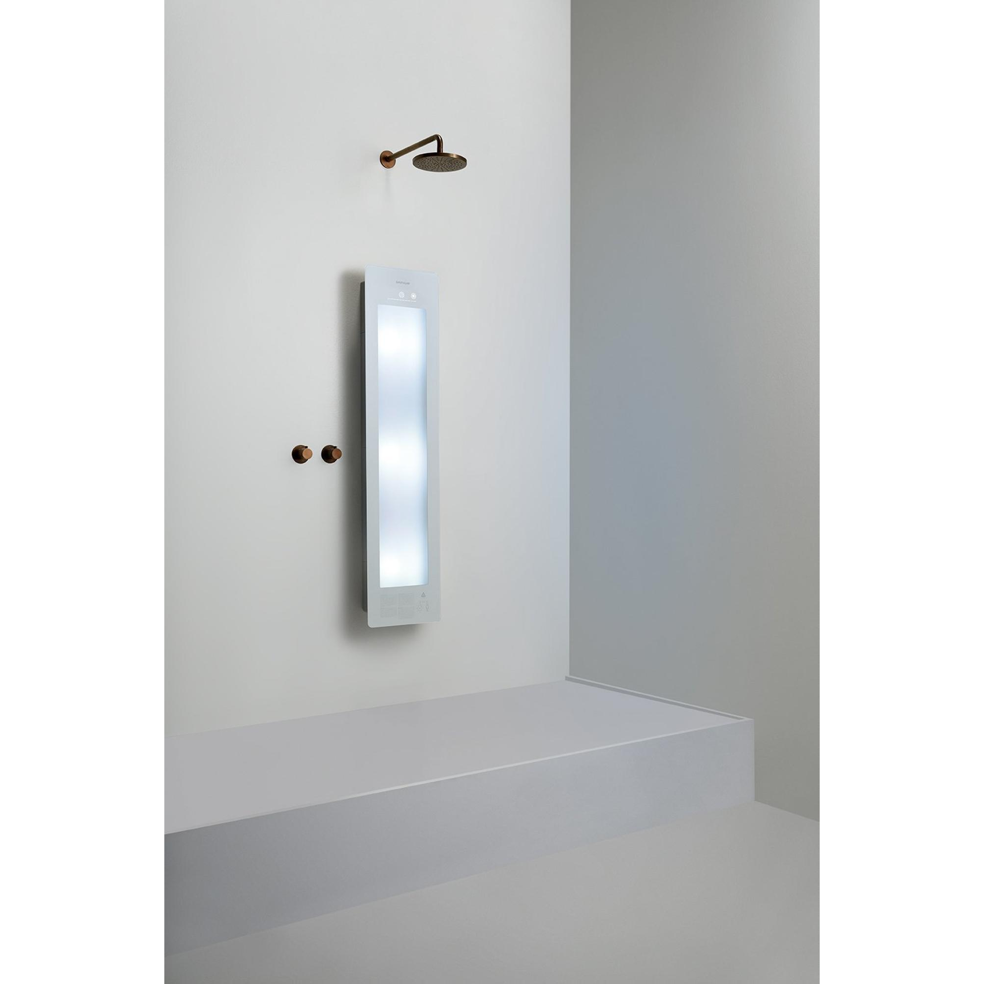 Imaginez un moment de pure détente et de bien-être, tout simplement dans votre propre salle de bains. Cet appareil innovant réunit chaleur et lumière pour transformer votre routine quotidienne en une véritable expérience bien-être. Les agréables rayons de chaleur enveloppent votre corps, stimulent votre circulation sanguine et aident à réduire les tensions et les douleurs. En même temps, la subtile lumière UV favorise la production naturelle de vitamine D et une peau saine et rayonnante. Grâce à son design fin et moderne, ce produit s'intègre sans effort dans toute salle de bains et lui confère une allure luxueuse. Avec une commande simple via un écran tactile, vous gardez un contrôle total sur votre moment bien-être personnel. Vous profitez ainsi chaque jour d'un coup de boost pour le corps et l'esprit, sans avoir à quitter votre domicile.
