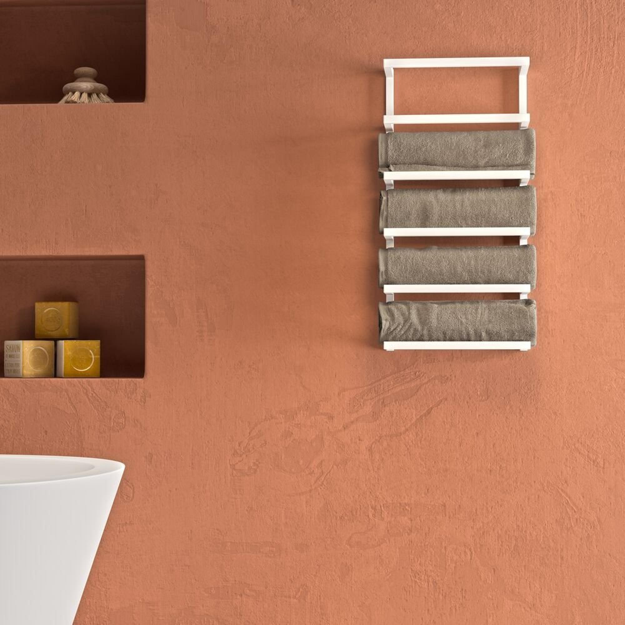 La couleur blanc mat donne immédiatement à votre salle de bains une touche fraîche et contemporaine. Le design rectangulaire et épuré s’accorde parfaitement avec des robinets modernes, des parois de douche droites et des meubles minimalistes, tout en formant un contraste subtil dans une salle de bains chaleureuse ou naturelle avec des tons de bois et de pierre. Grâce à sa couleur douce, le porte-serviettes n’attire pas l’attention de manière excessive, mais constitue au contraire un détail élégant qui complète l’aménagement global de votre salle de bains. Le style Carré offre en outre un tracé clair des lignes, ce qui donne à la pièce une impression d’ordre et d’espace, même lorsque le porte-serviettes est rempli de serviettes.