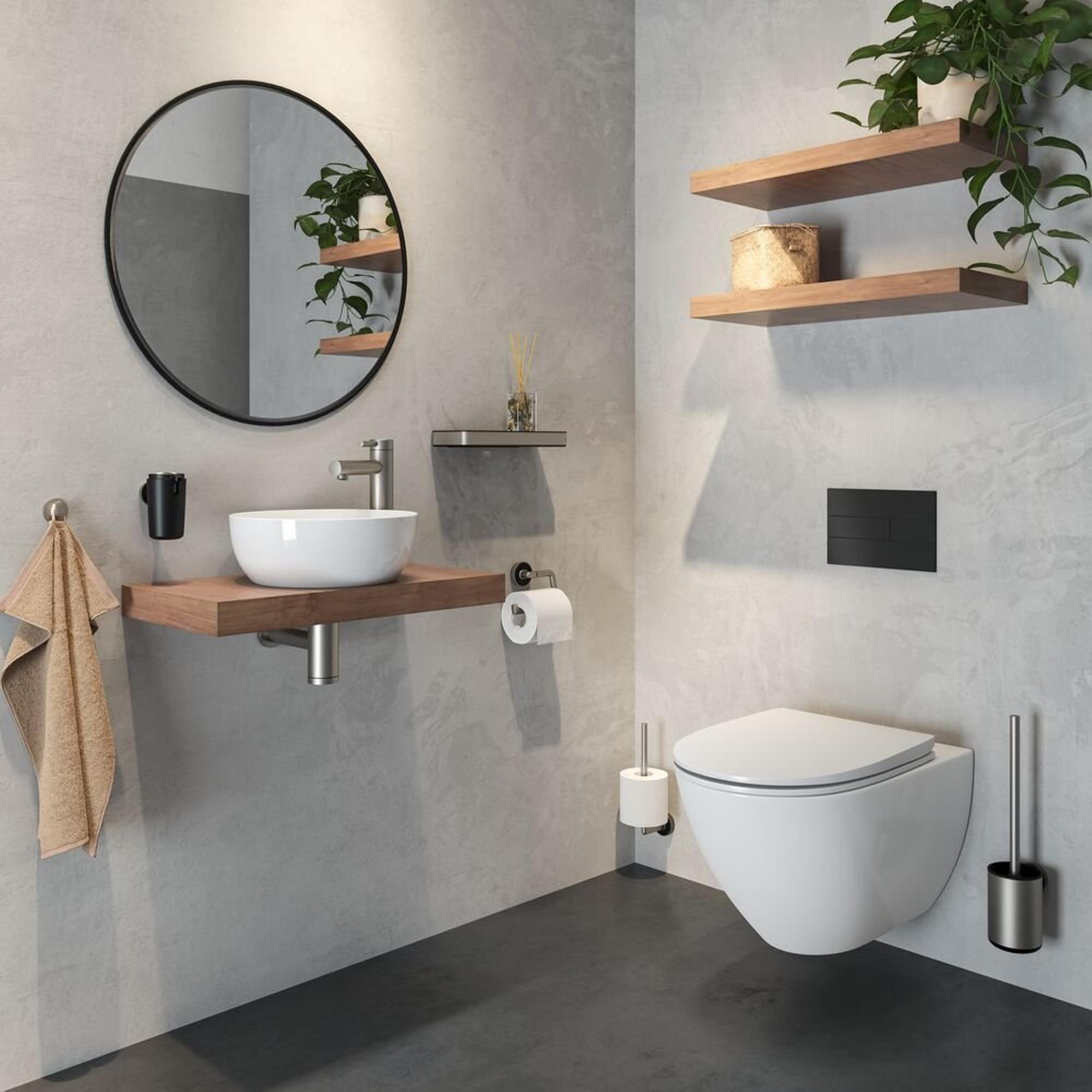 Les lignes arrondies et organiques confèrent à ce porte-rouleau de papier toilette une apparence accueillante qui apporte immédiatement de la sérénité à la pièce. La combinaison de l’inox brossé avec un détail noir subtil crée une touche moderne, de sorte que l’accessoire s’accorde parfaitement avec des robinets noirs, des profilés de douche en inox ou d’autres accents en métal mat. Le fait que le porte-rouleau soit ouvert maintient un look aéré et minimaliste, ce qui fait d’autant plus la différence dans les petits WC. Le résultat est un ensemble élégant où la forme et la fonction se renforcent mutuellement : vous faites un choix de design réfléchi qui rehausse visuellement le niveau de votre salle de bains ou de vos toilettes.