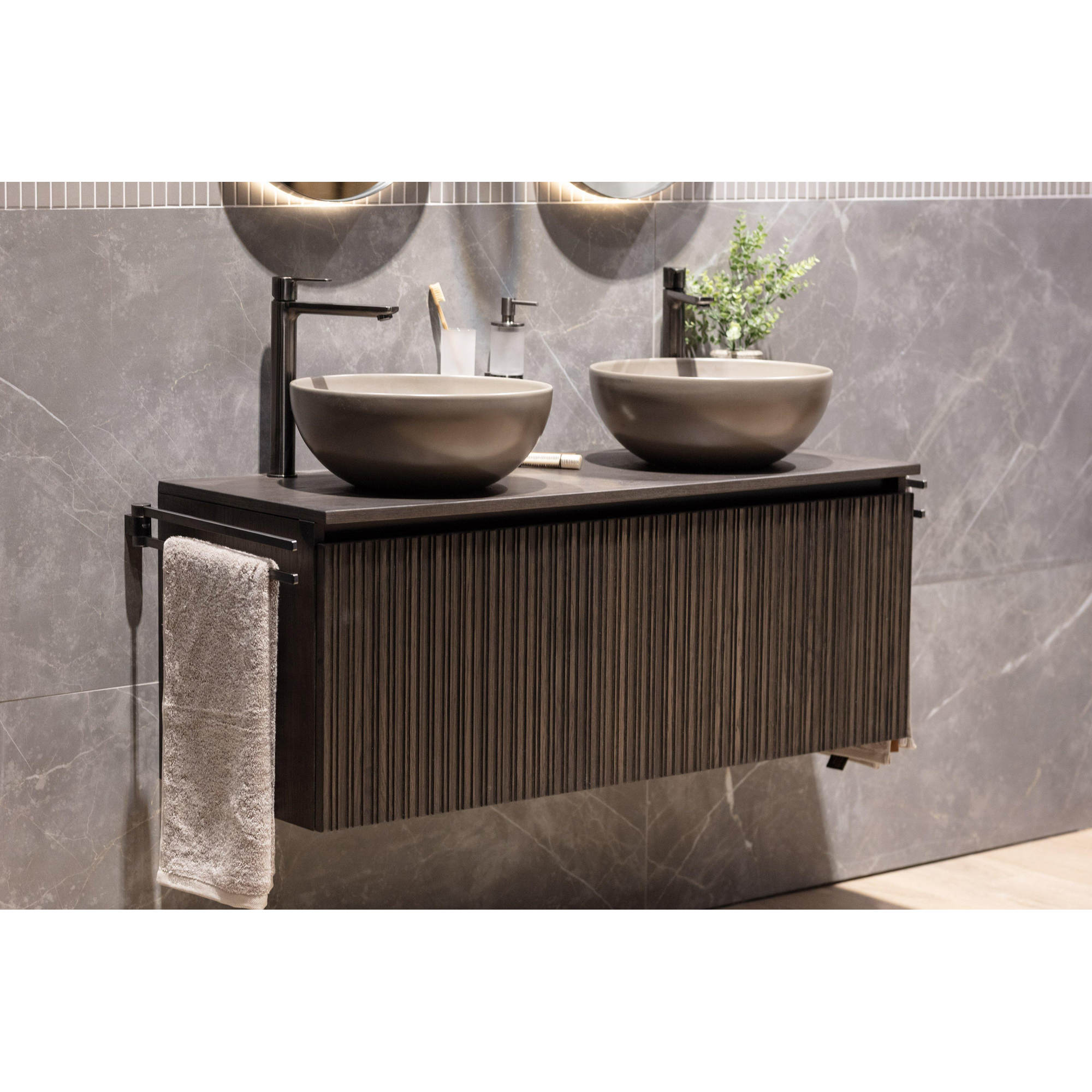 Avec ce meuble sous lavabo, vous offrez à votre salle de bains une mise à niveau élégante et pratique immédiate. Le bois de chêne foncé apporte une apparence chaleureuse et naturelle qui rend chaque espace accueillant. Grâce au design sans poignée, vous profitez d’un meuble épuré et moderne qui s’intègre facilement dans divers styles de salle de bains. La largeur généreuse de 120 cm vous offre suffisamment d’espace pour ranger tous vos accessoires de salle de bains de manière ordonnée et claire. Ainsi, vous créez non seulement une salle de bains rangée, mais aussi un endroit où vous commencez et terminez chaque jour avec plaisir. Ce meuble combine fonctionnalité et design intemporel, ce qui en fait un investissement précieux pour votre intérieur de salle de bains.