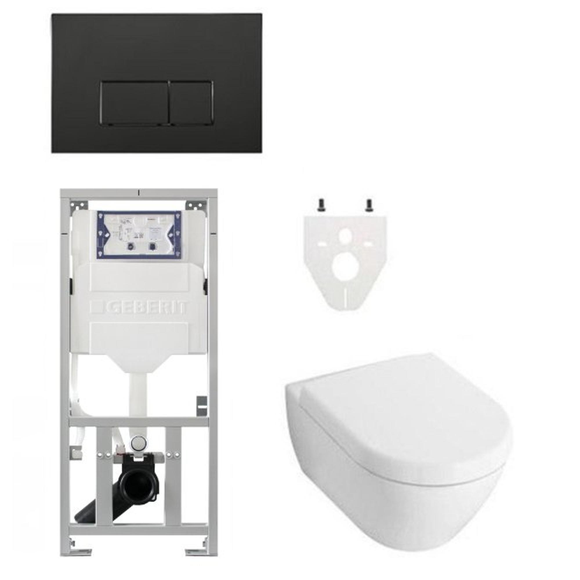 Ensemble de toilettes à chasse directe villeroy and boch avec réservoir de chasse et plaque de commande geberit avec boutons rectangulaires abattant à fermeture progressive noir mat