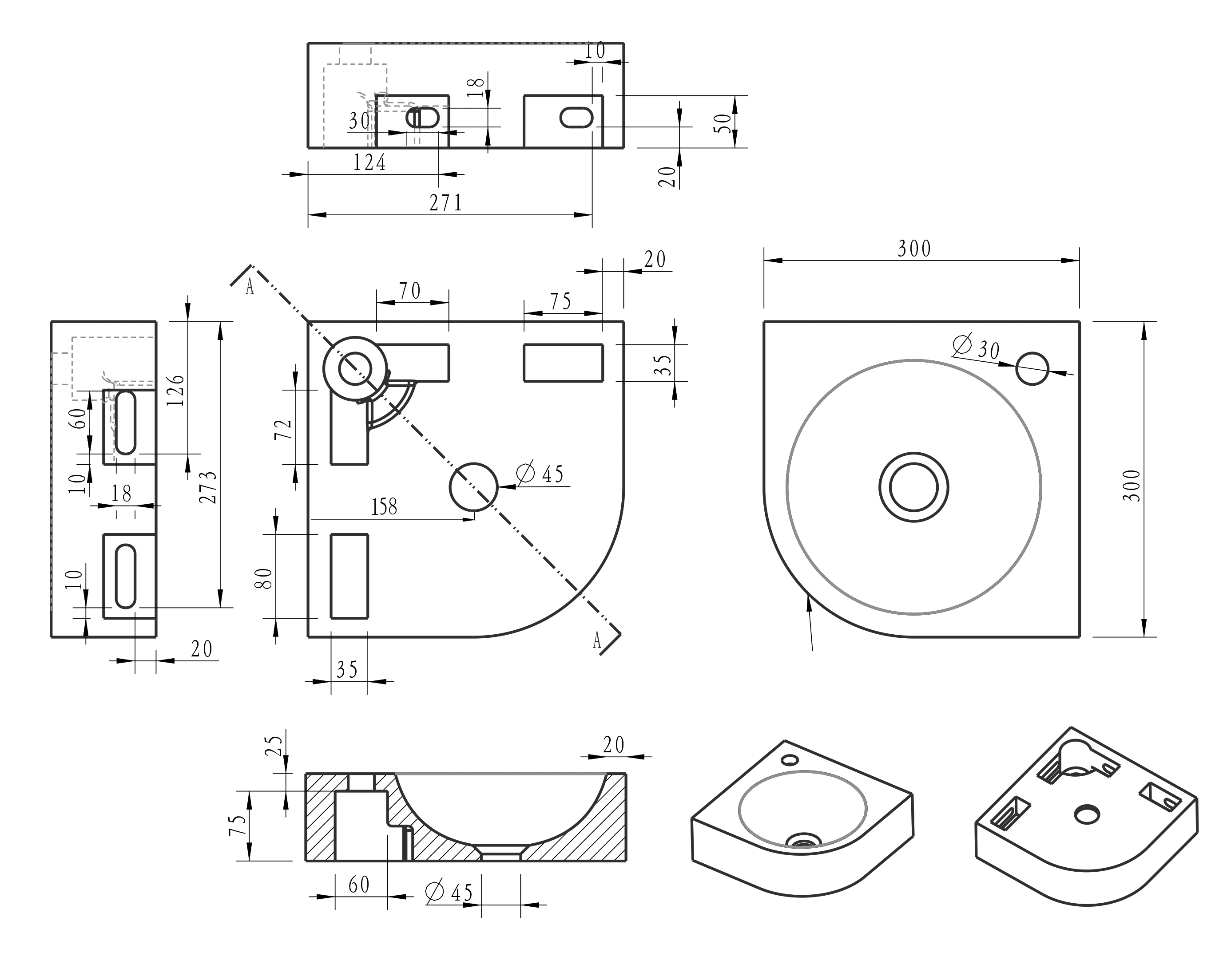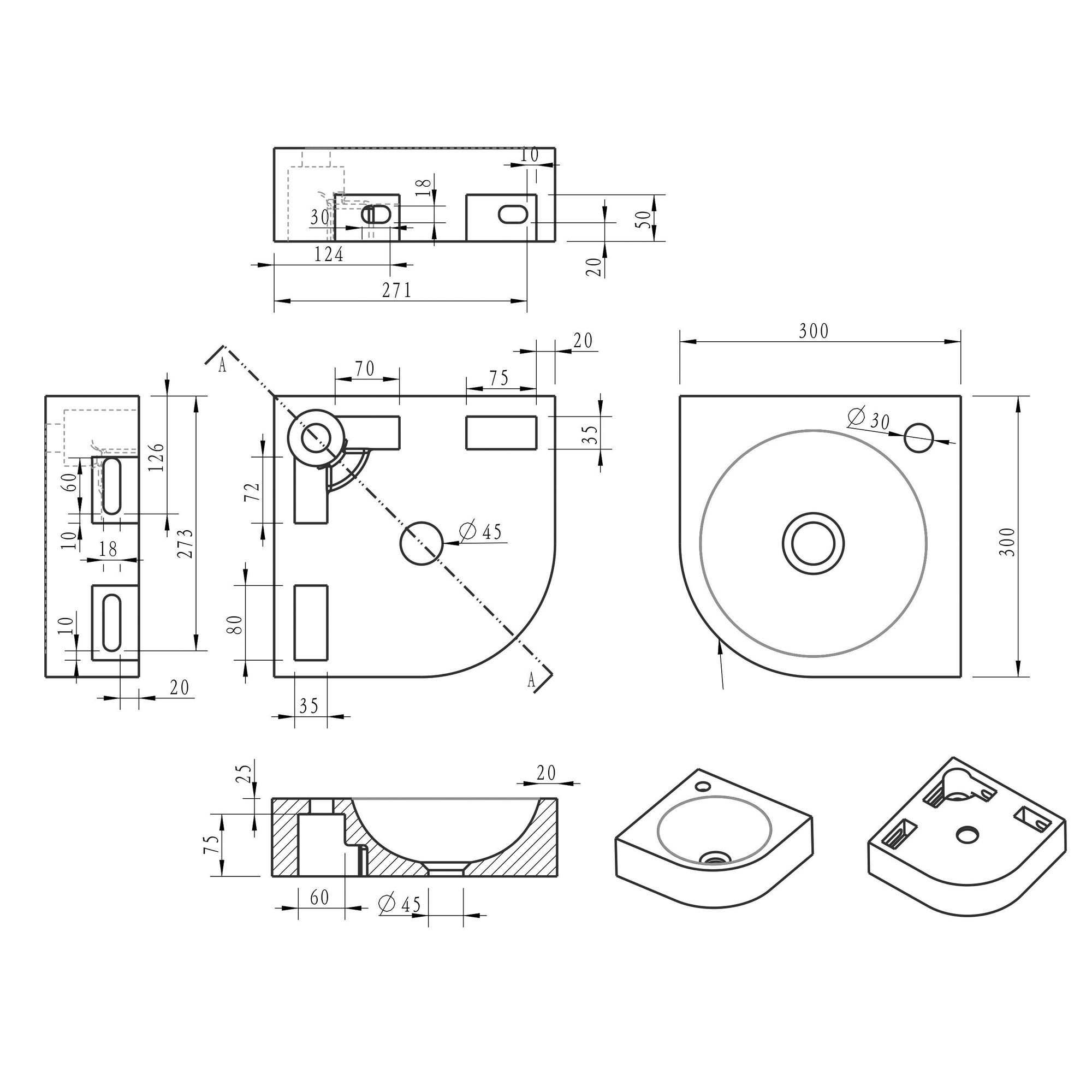 - Modèle d’angle compact de 30x30x10 cm, idéal pour les petites toilettes et salles de bains