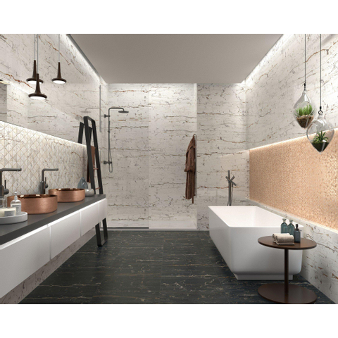 - Se combine joliment avec des carreaux de base neutres, des teintes bois et des robinets noirs comme métalliques.