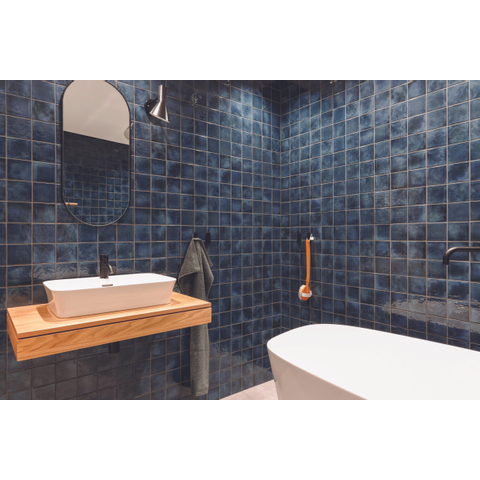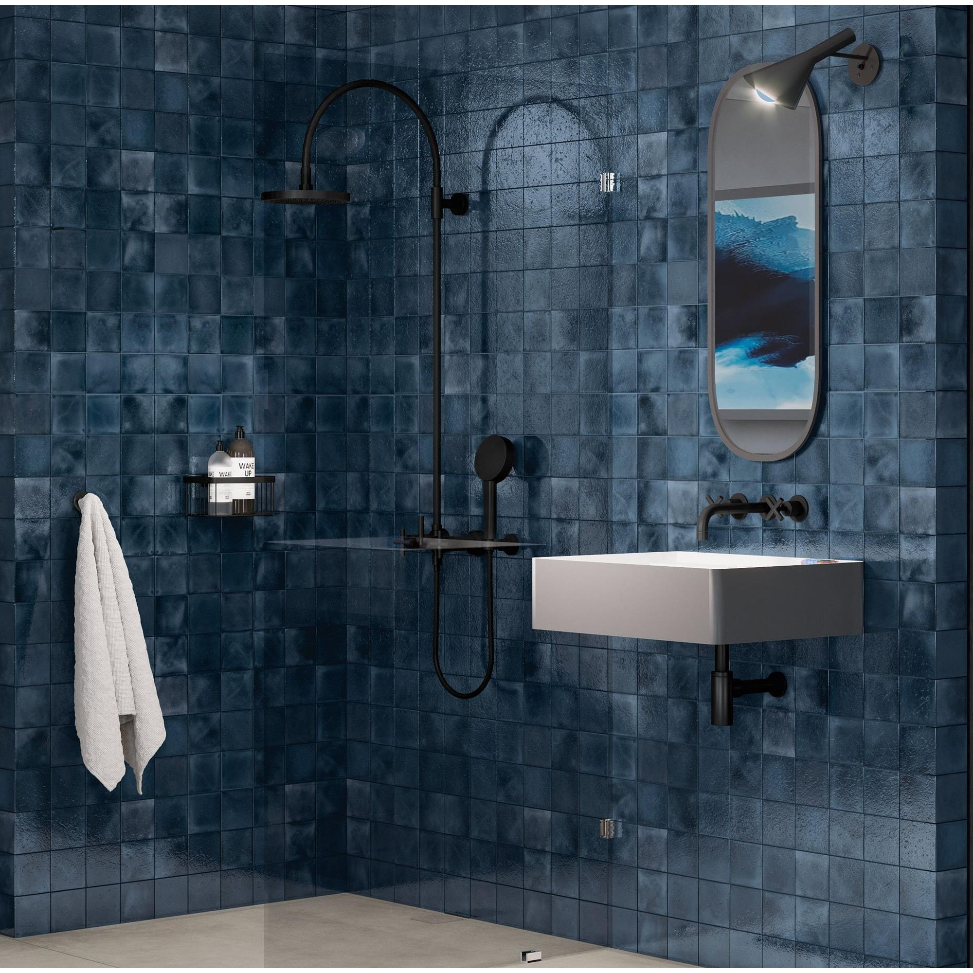 Si vous recherchez un carreau mural particulier qui apporte immédiatement atmosphère et caractère à votre salle de bains, vos toilettes, votre cuisine ou même votre espace bien-être, alors cette mosaïque est une option très intéressante. L’association de l’indigo profond et de la finition brillante crée un aspect luxueux, presque digne d’un hôtel, tandis que le format et la base en porcelaine restent au contraire très pratiques et durables. Ce type de mosaïque est idéal comme mur accent dans la douche, derrière la baignoire ou comme crédence marquante derrière le meuble de salle de bains, mais elle est également du plus bel effet comme crédence de cuisine élégante ou dans une niche. Grâce à la mosaïque sur trames, vous pouvez également habiller facilement les courbes, les niches et les surfaces plus petites, ce qui en fait un choix judicieux aussi bien pour les projets de rénovation que pour les salles de bains entièrement neuves. Vous créez ainsi, avec une surface relativement réduite, un grand effet décoratif.