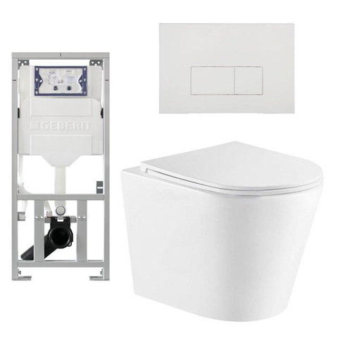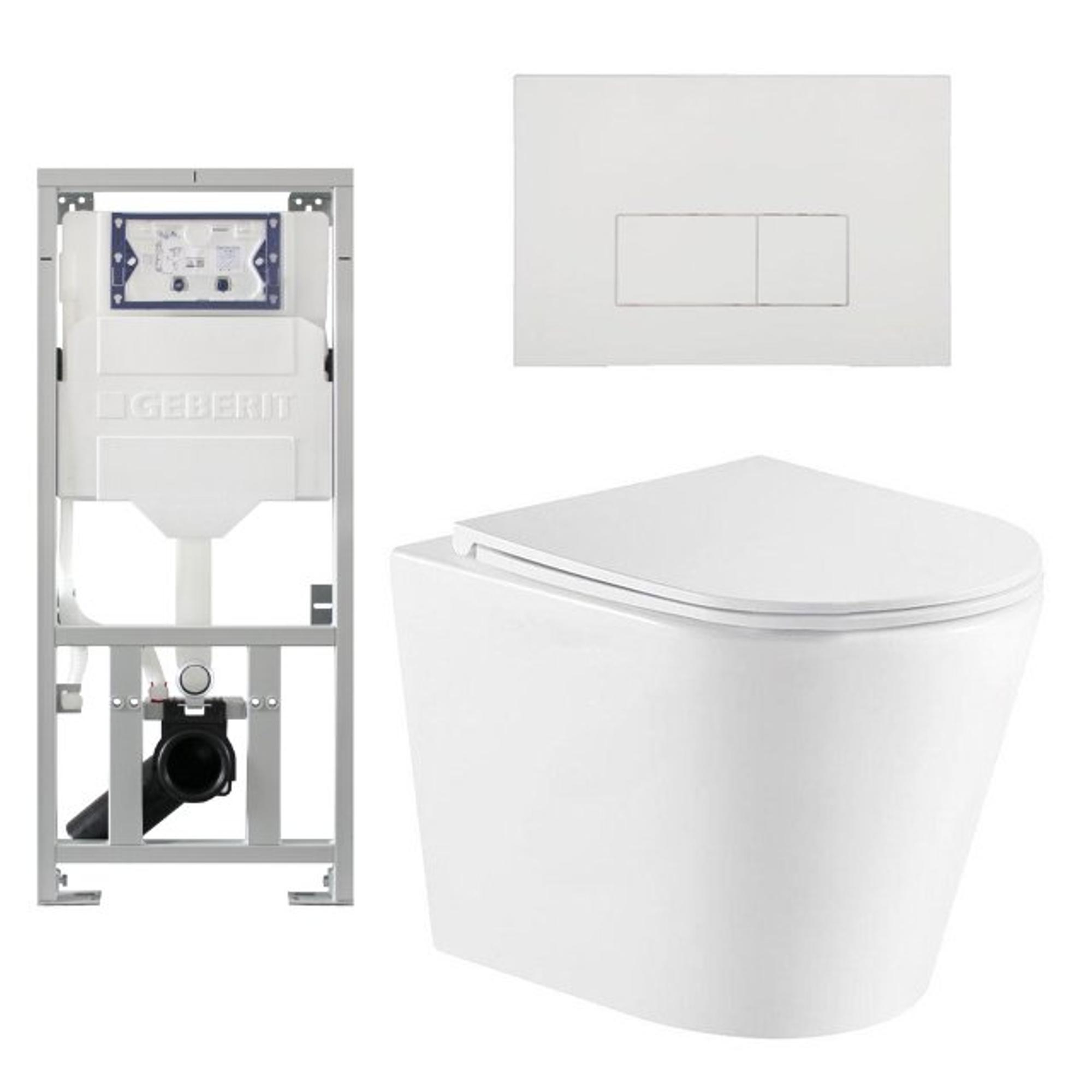 QeramiQ Dely Pack WC cuvette sans bride 36.3x51.7cm avec bâti-support Geberit UP320 abattant WC blanc mat frein de chute et plaque de commande Blanc mat boutons Rectangulaires