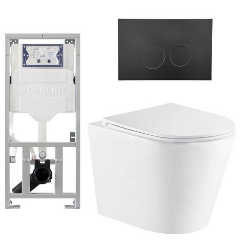 QeramiQ Dely Pack WC cuvette sans bride 36.3x51.7cm avec bâti-support Geberit UP320 abattant WC blanc mat frein de chute et plaque de commande Noir mat boutons Ronds