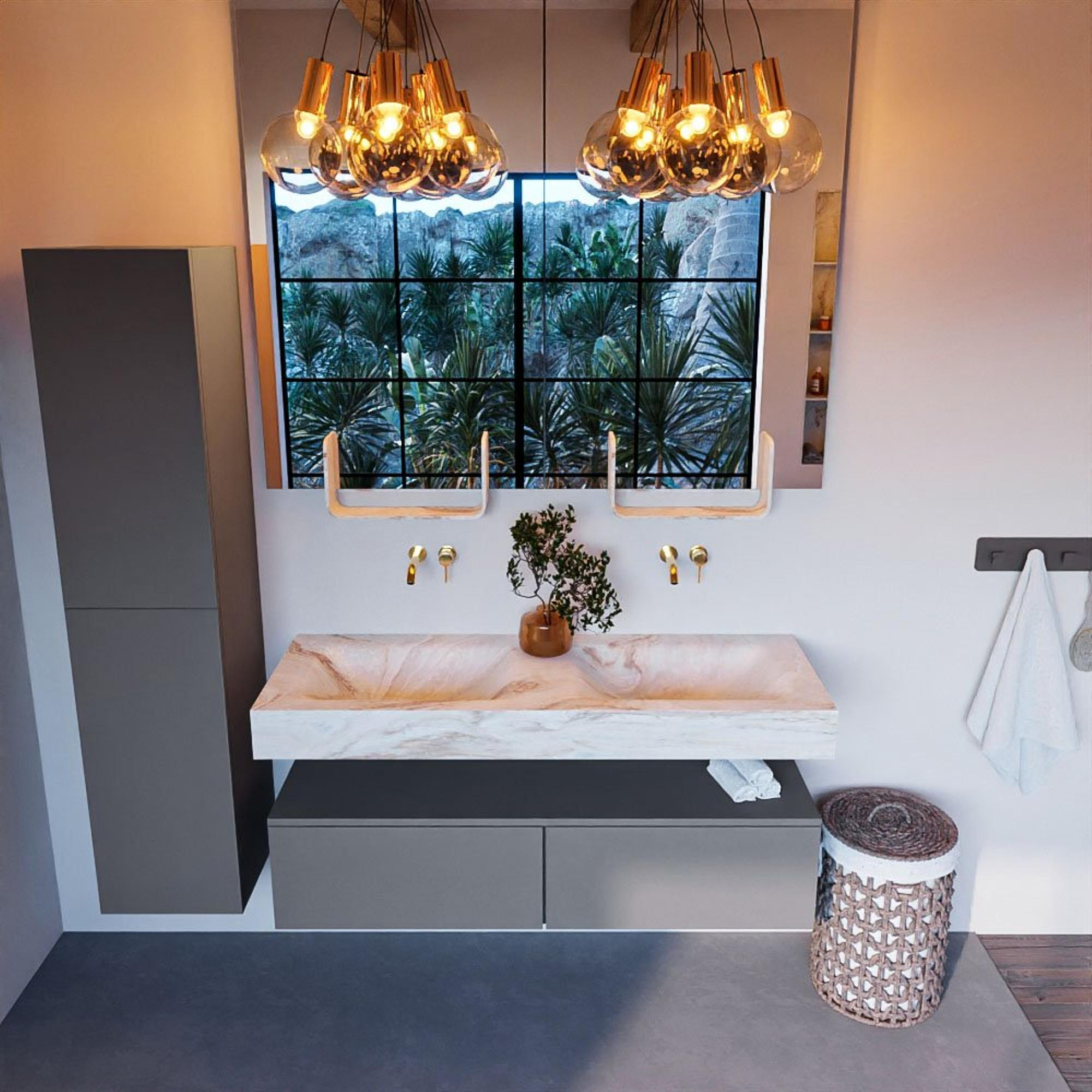 Le design suspendu donne à votre salle de bains une apparence moderne et luxueuse, tout en veillant à ce que le sol reste bien visible. Cela donne non seulement une impression d’espace, mais rend également le nettoyage autour du meuble beaucoup plus facile. Le double lavabo est idéal si vous souhaitez être à deux devant le miroir en même temps, par exemple pendant la routine du matin ou du soir. Comme aucun trou de robinet n’est pré-percé, vous pouvez vous-même opter pour des mitigeurs sur plage élégants ou un robinet encastré dans le mur. Vous harmonisez ainsi parfaitement l’ensemble avec le reste de votre équipement sanitaire et créez une ambiance cohérente dans votre salle de bains.