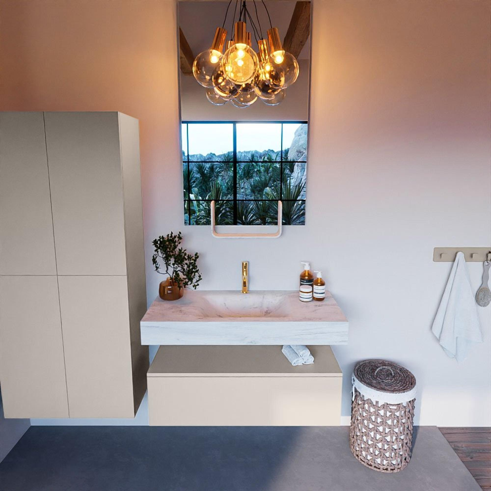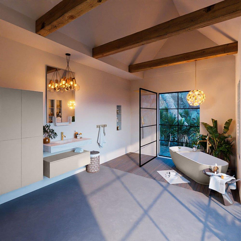 La couleur Linen mate laquée donne immédiatement à votre salle de bains une apparence douce et élégante qui se marie facilement avec des carreaux aussi bien clairs que foncés. Grâce aux façades épurées sans poignées, l’ensemble paraît moderne et sobre, sans être criard. Le meuble bas suspendu accentue la ligne horizontale de 100 cm de large, ce qui agrandit visuellement l’espace. Cela rend l’ensemble parfait si vous visez un style hôtel-chic ou scandinave, où les tons naturels, la simplicité et le calme sont au centre. De plus, la finition mate du meuble fait que les traces de doigts se voient moins vite que sur du brillant, ce qui rend l’ensemble non seulement plus esthétique, mais aussi un peu plus indulgent dans l’usage quotidien.