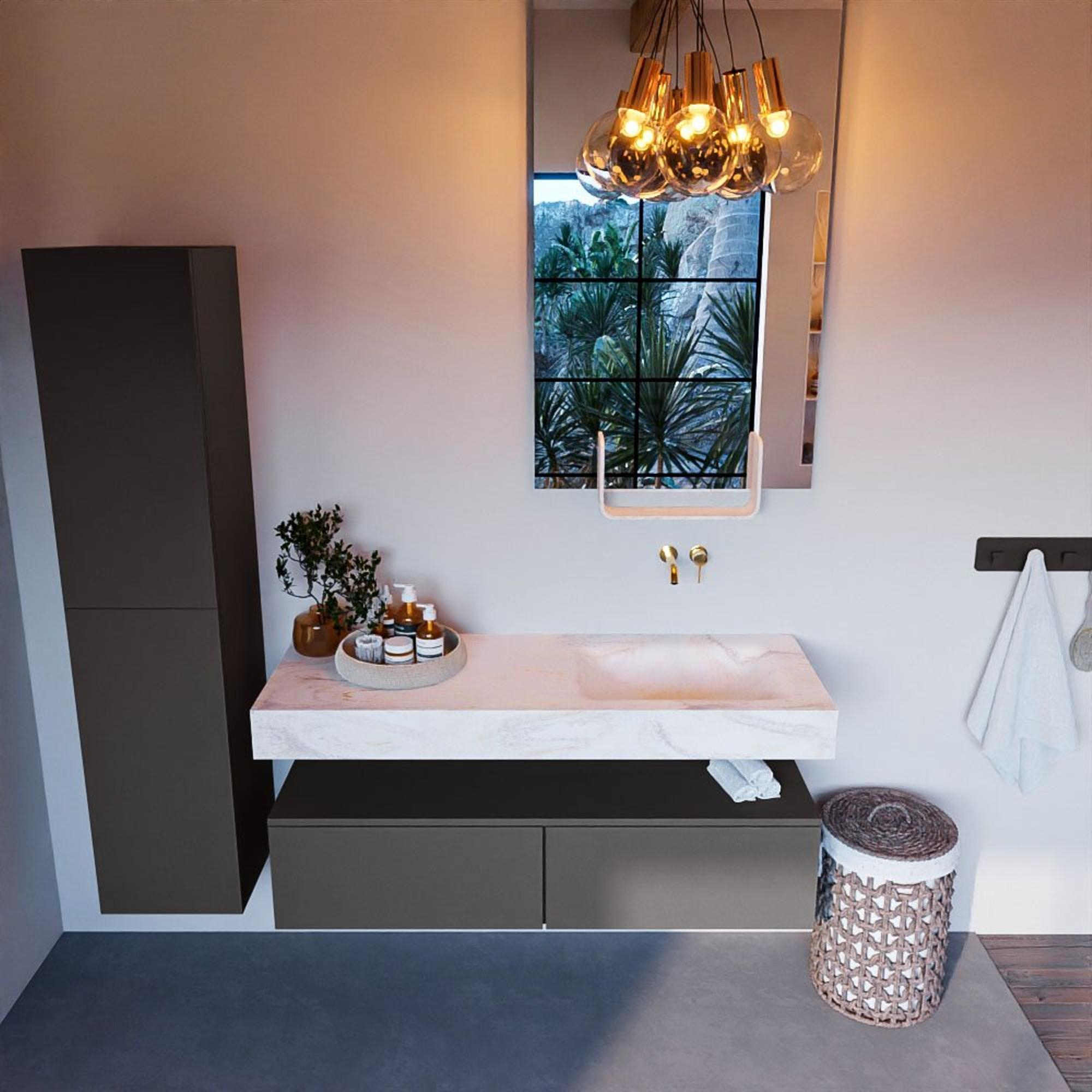 Le meuble bas gris foncé mat forme une base élégante qui s'accorde sans effort avec les salles de bains contemporaines au style industriel, moderne ou hôtel-chic. Le lavabo Ostra, avec son aspect luxueux façon marbre, y ajoute une subtile sensation de spa et crée un beau point de mire dans la pièce. Le contraste entre le dark grey profond et la surface de lavabo claire et élégante donne à l'ensemble une apparence haut de gamme, sans être criard. Comme la combinaison de couleurs est intemporelle, ce meuble se marie bien avec une grande variété de types de carrelages et d'accessoires : des tons naturels sobres de pierre aux robinets noirs marqués et aux profilés de douche noirs mats. C'est donc un choix sûr mais particulièrement chaleureux si vous souhaitez donner à votre salle de bains une mise à niveau moderne dont vous serez satisfait pendant des années.