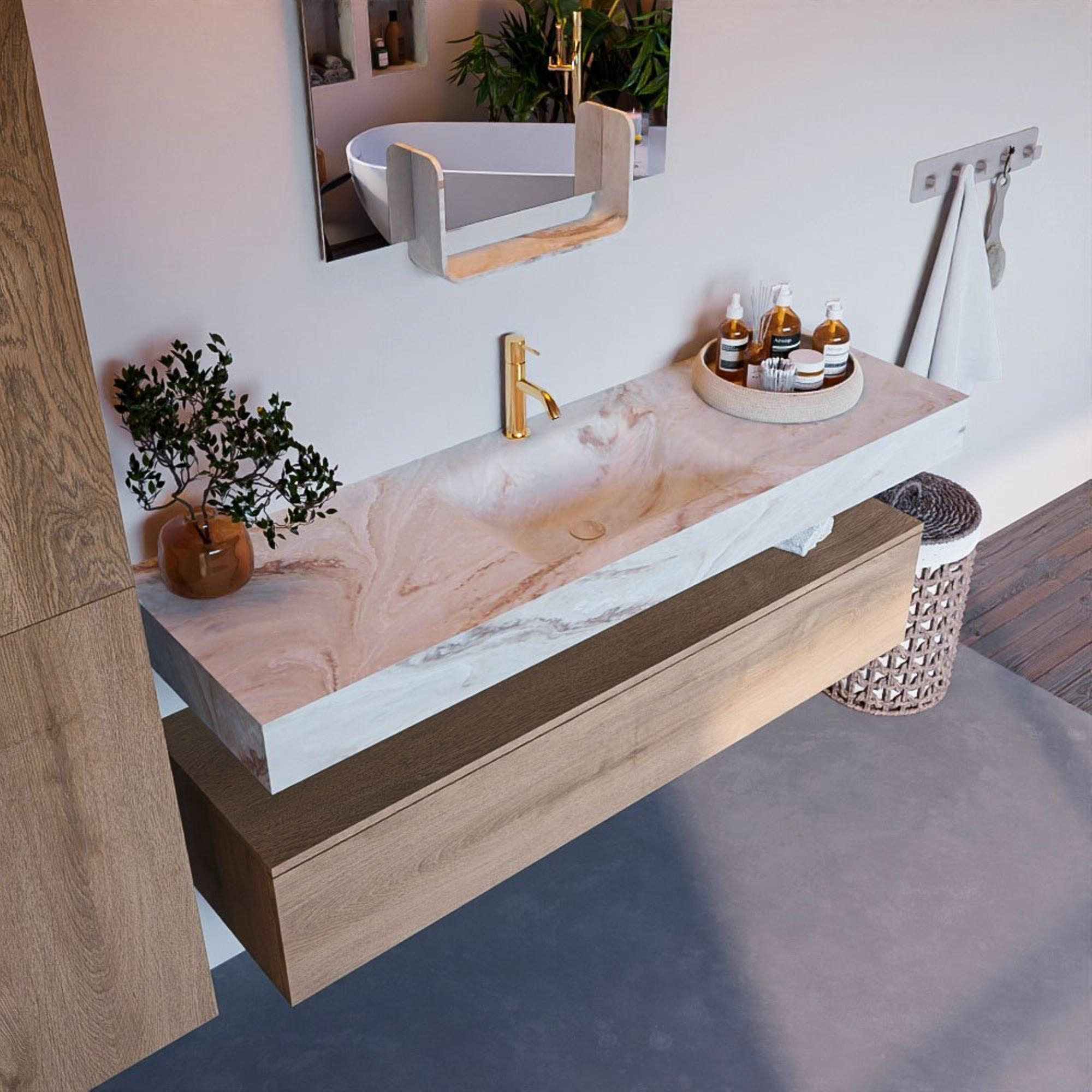 Comme le meuble est monté en suspension, le sol reste visible et l’espace paraît immédiatement plus grand et plus aéré. C’est un grand avantage dans les salles de bains où vous souhaitez créer une sensation d’ouverture et de luxe, mais où les mètres carrés sont parfois limités. Sous le meuble, il reste de la place pour un éclairage d’ambiance subtil ou un pèse-personne, sans que cela paraisse désordonné. La vasque placée au centre avec un seul trou de robinet crée un point de mire symétrique dans la pièce et facilite grandement le choix d’un robinet assorti. L’ensemble s’harmonise sans effort avec des carreaux modernes, des sols aspect béton et d’autres styles de salle de bains contemporains, de sorte que vous créez un ensemble uniforme dans lequel tous les éléments sont coordonnés.