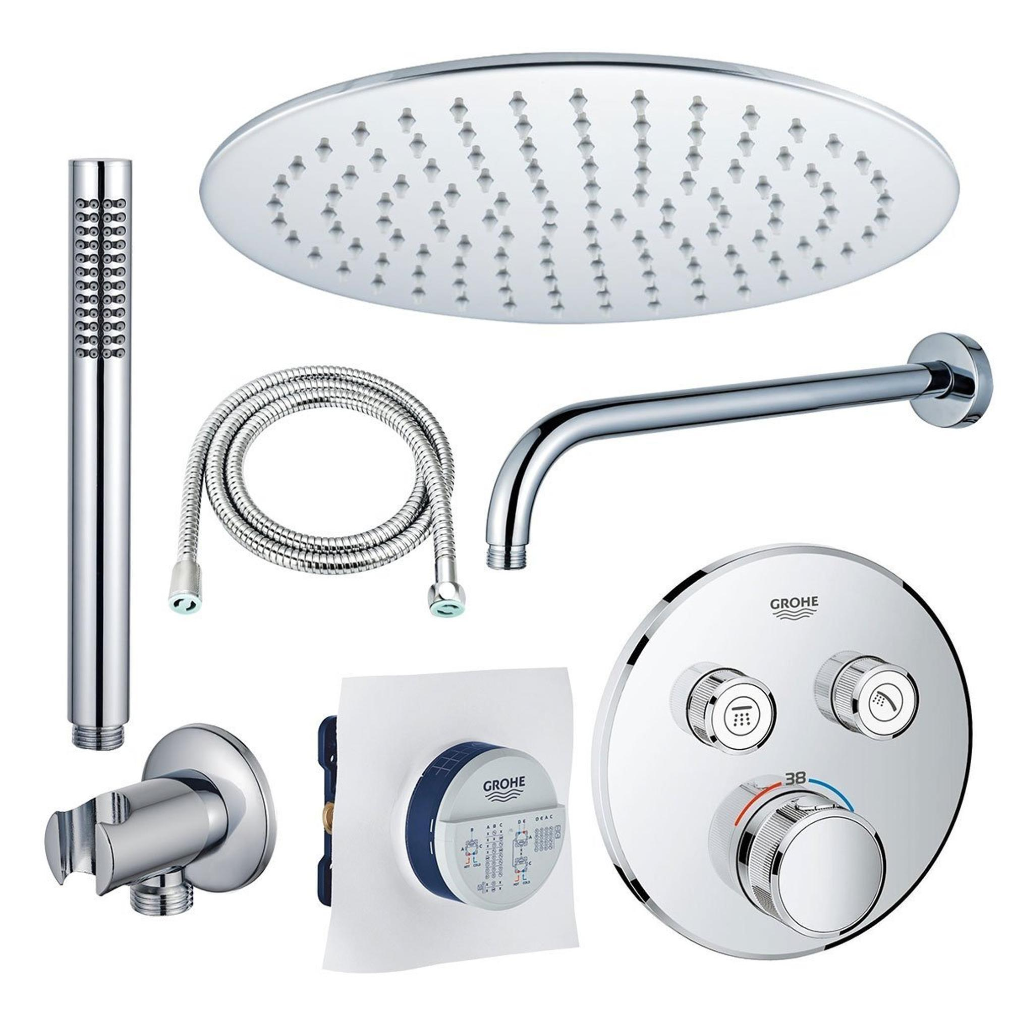 Grohe - Adema Rise Ensemble de douche pluie encastré - 2 fonctions - avec pomme de douche Adema Rise 25cm - douchette sur barre - bras mural - thermostat encastré Grohe Grohtherm - chrome