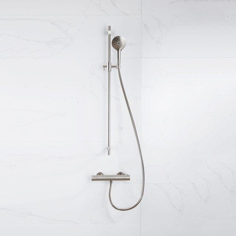 Fortifura Calvi Ensemble de douche barre curseur avec douchette ronde, flexible en métal et robinet de douche Inox brossé PVD
