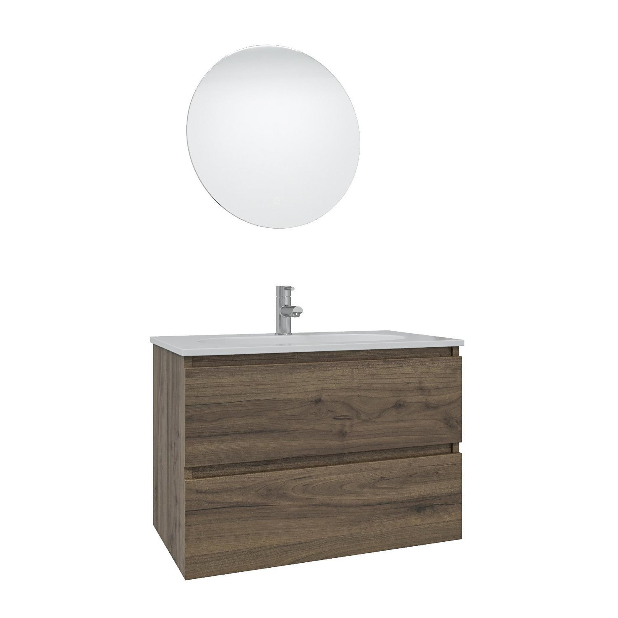 Saniclass Chaci Ensemble meuble de salle de bains - 80x46x57cm - lavabo en céramique blanc - 1 vasque ovale - 1 trou de robinet - 2 tiroirs - miroir rond avec éclairage - noyer (bois)