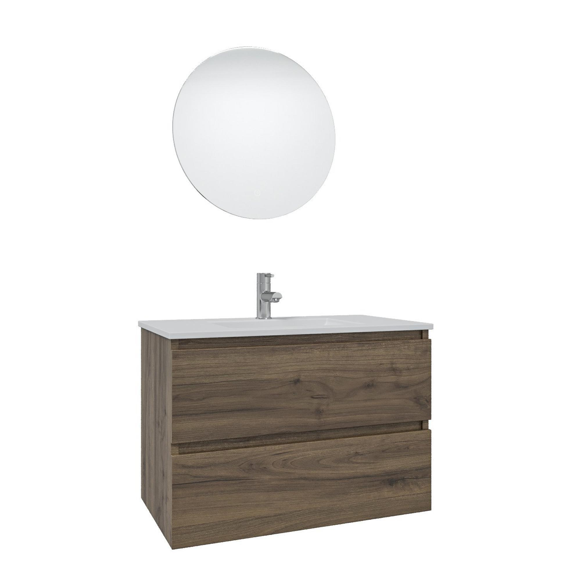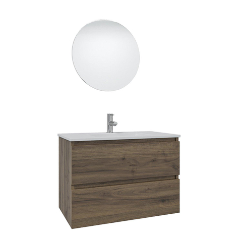 Saniclass Chaci Ensemble meuble de salle de bains - 80x46x55cm - lavabo en céramique blanc - 1 vasque - 1 trou de robinet - 2 tiroirs - miroir rond avec éclairage - noyer (bois)