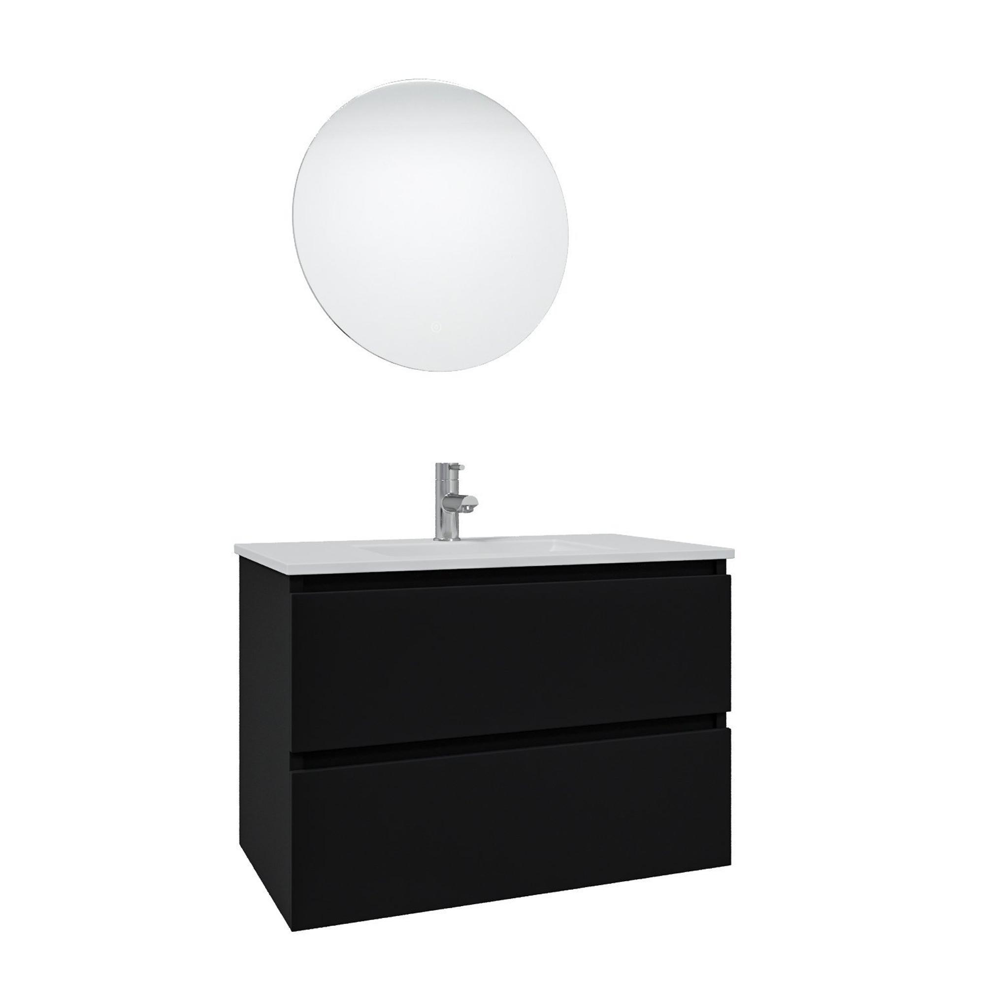 Saniclass Chaci Ensemble meuble de salle de bains - 80x46x55cm - lavabo en céramique blanc - 1 vasque - 1 trou de robinetterie - 2 tiroirs - miroir rond avec éclairage - noir mat
