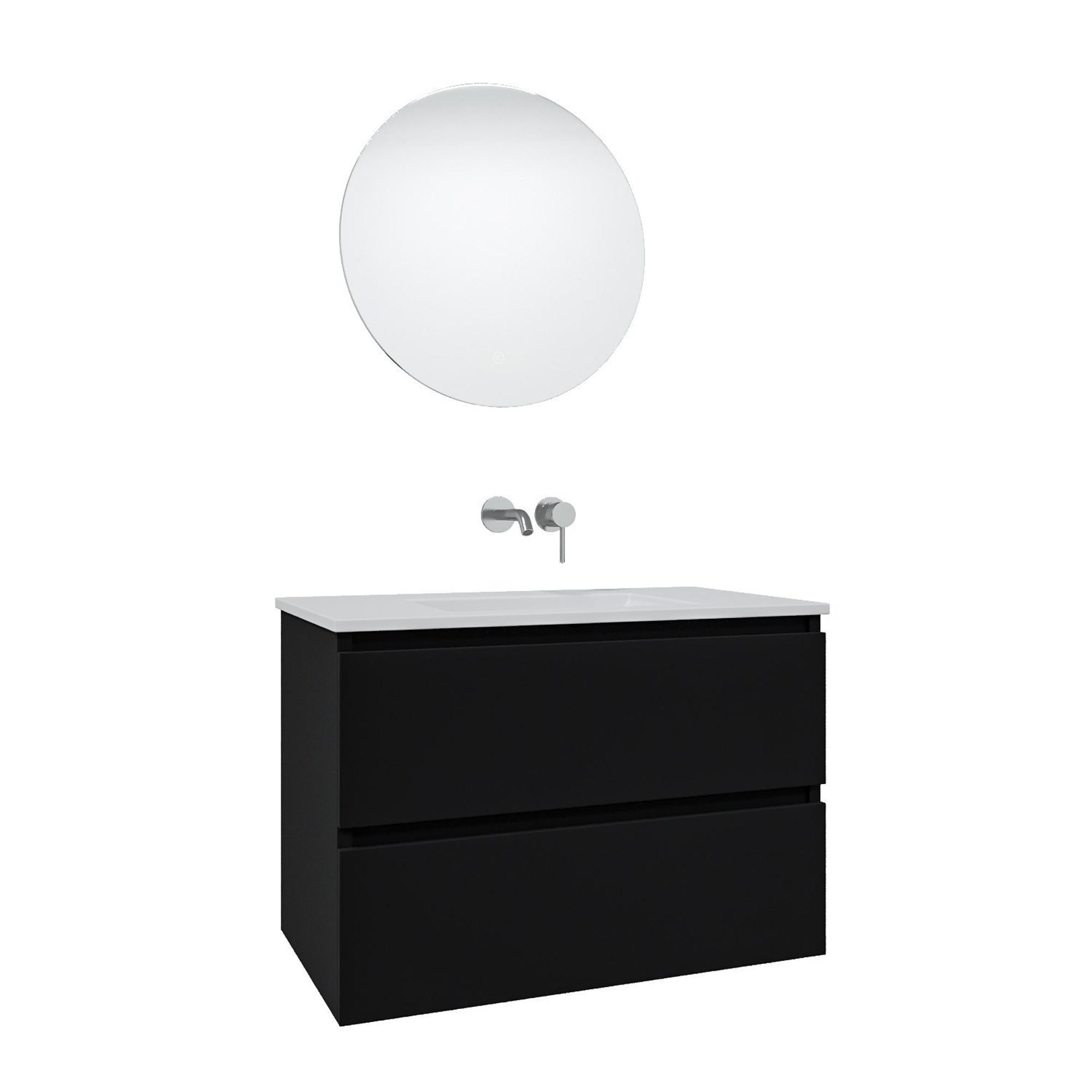 Saniclass Chaci Ensemble meuble de salle de bains - 80x46x55cm - vasque en céramique blanche - 1 vasque - sans trous de robinet - 2 tiroirs - miroir rond avec éclairage - noir mat