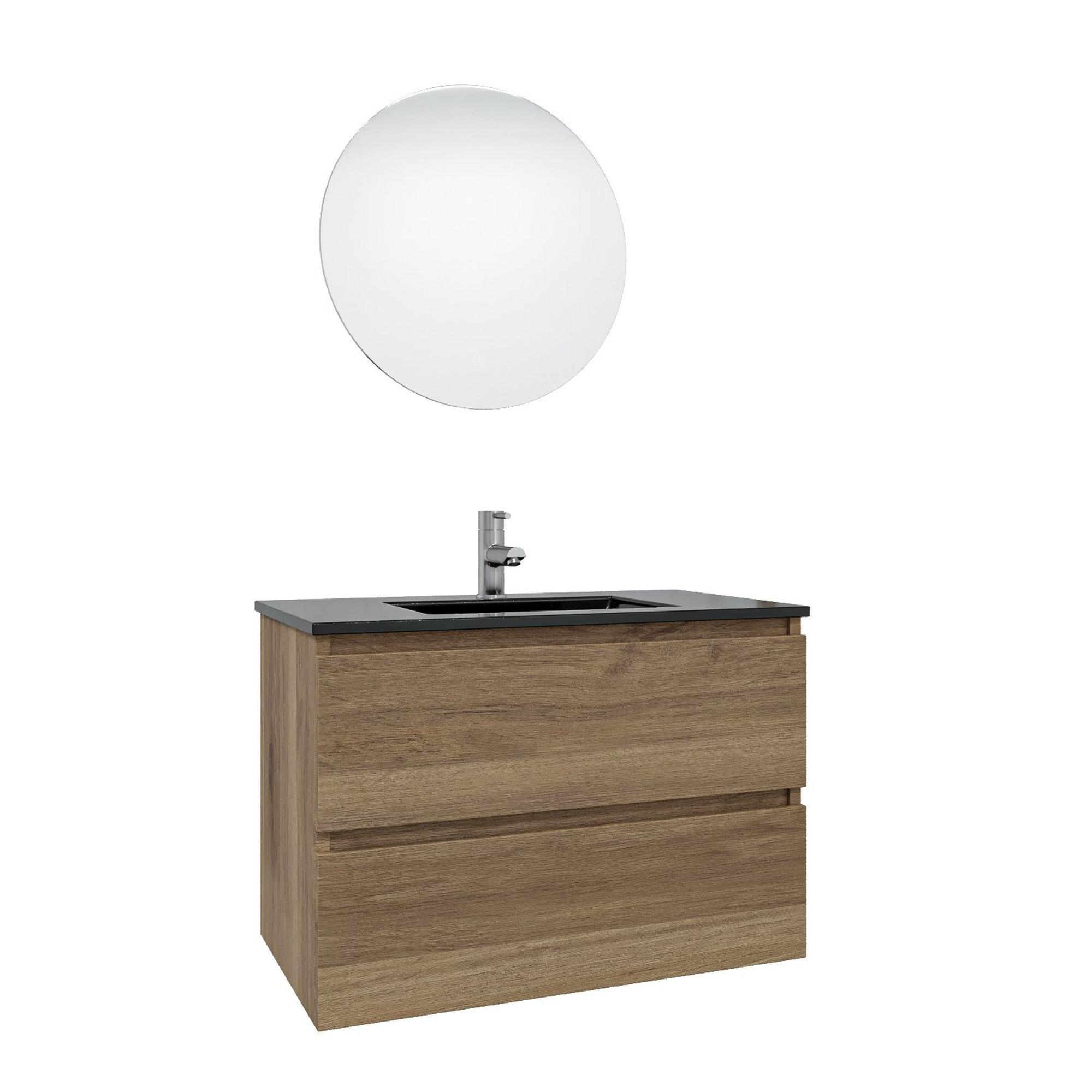 Saniclass Chaci Ensemble meuble de salle de bains - 80x46x55cm - vasque en céramique noire - 1 lavabo - 1 trou de robinet - 2 tiroirs - miroir rond avec éclairage - chêne