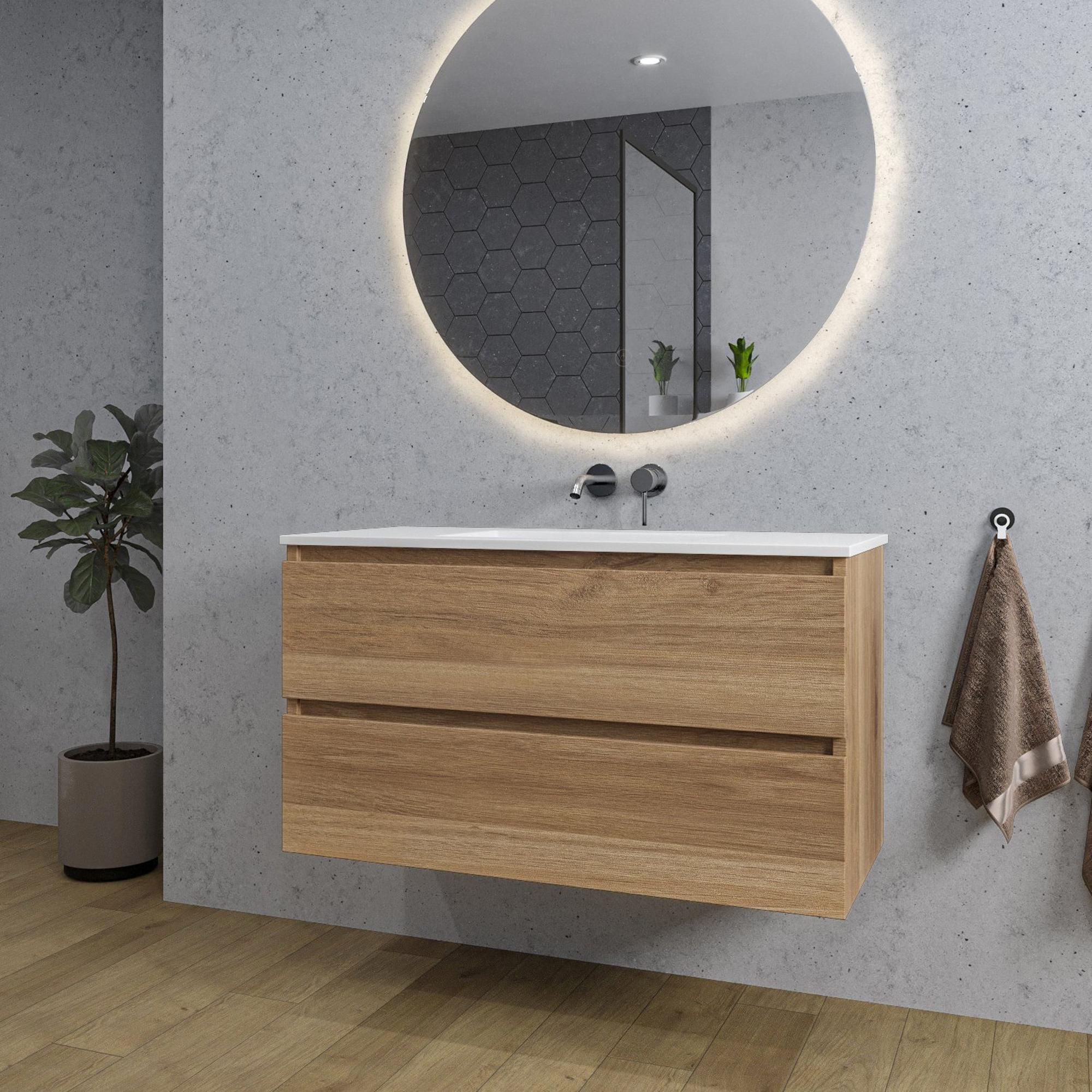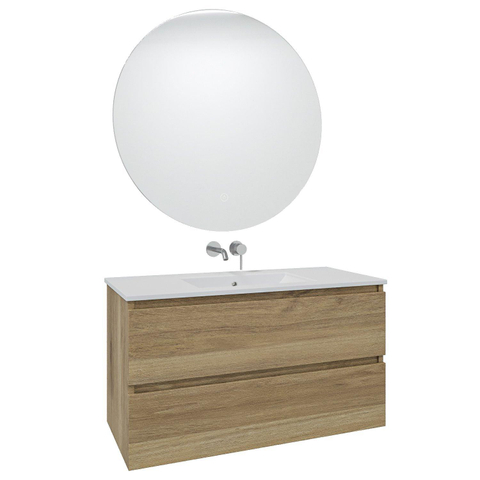 Saniclass Chaci Ensemble meuble de salle de bains - 100x46x57cm - vasque en céramique blanche - 1 vasque - sans trous de robinetterie - 2 tiroirs - miroir rond avec éclairage - chêne