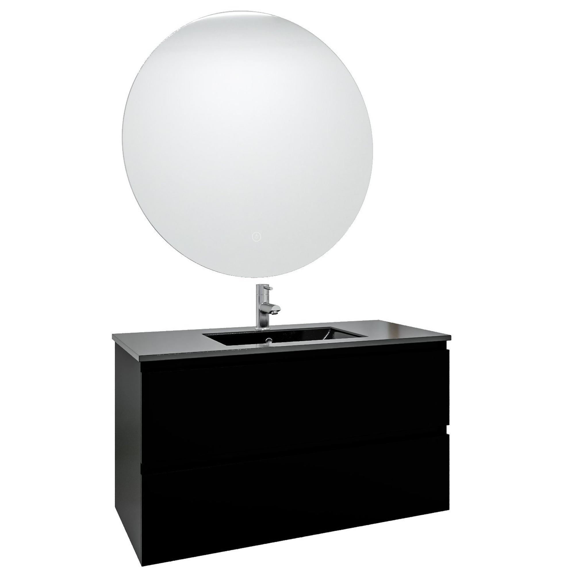 Saniclass Chaci Ensemble meuble de salle de bains - 100x46x55cm - lavabo céramique noir - 1 vasque - 1 trou de robinet - 2 tiroirs - miroir rond avec éclairage - noir mat