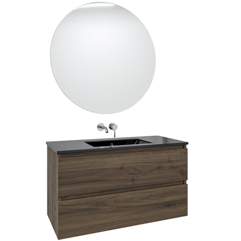 Saniclass Chaci Ensemble meuble de salle de bains - 100x46x55cm - lavabo céramique noir - 1 vasque - sans trous de robinet - 2 tiroirs - miroir rond avec éclairage - noyer (bois)