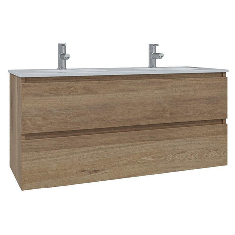 Saniclass Chaci Ensemble meuble de salle de bains - 120x46x57cm - lavabo céramique blanc - 2 vasques ovales - 2 trous de robinetterie - 2 tiroirs - miroir rond avec éclairage - chêne
