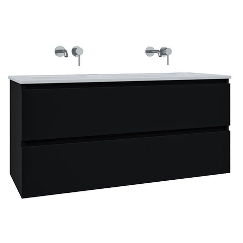 Saniclass Chaci Ensemble meuble de salle de bains - 120x46x55cm - vasque en céramique blanche - 2 lavabos - sans trous de robinetterie - 2 tiroirs - miroir rond avec éclairage - noir mat