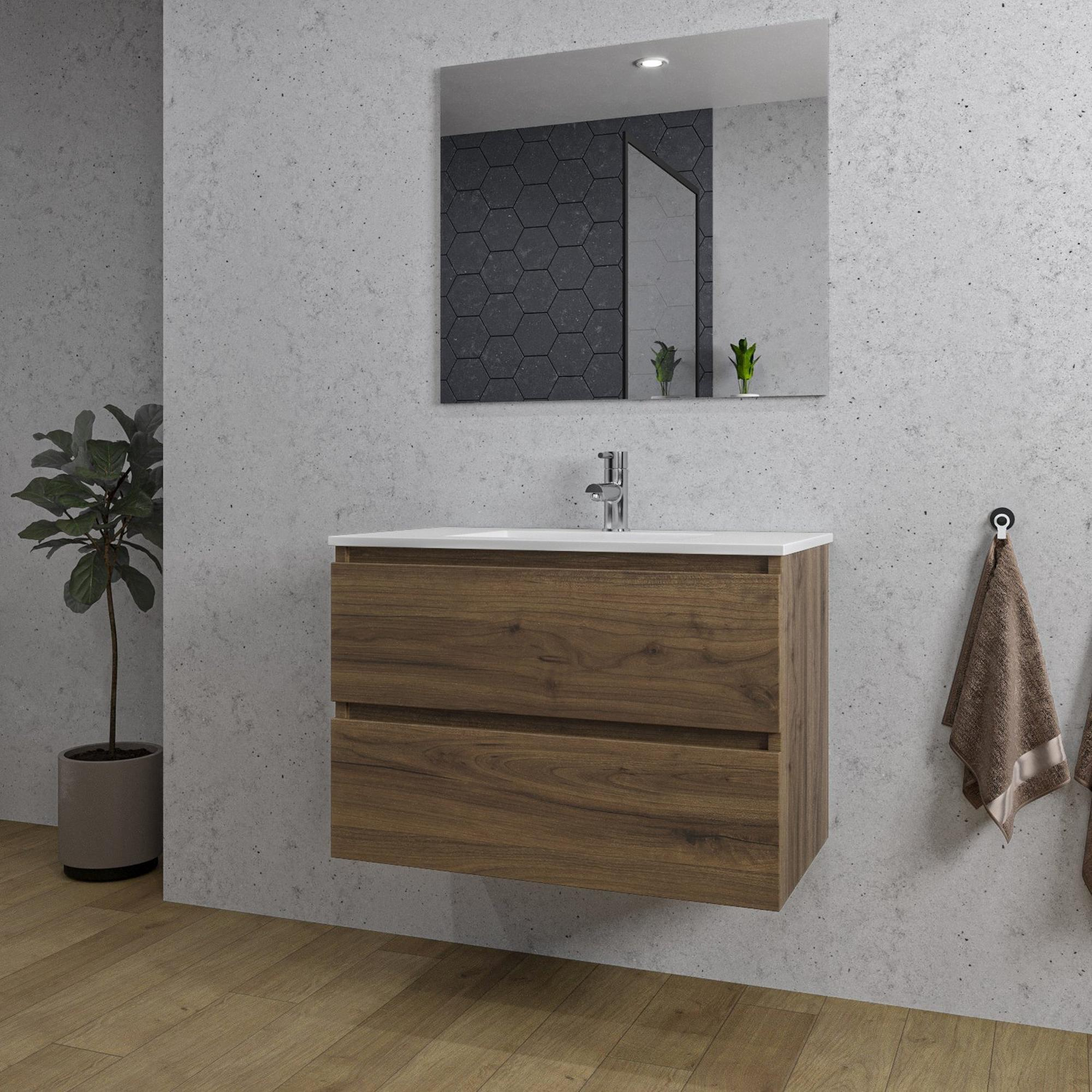 Saniclass Chaci Ensemble meuble de salle de bains - 80x46x55cm - lavabo en céramique blanc - 1 vasque - 1 trou de robinet - 2 tiroirs - miroir rectangulaire - noyer (bois)