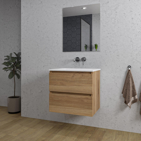 Saniclass Chaci Ensemble meuble de salle de bains - 60x46x55cm - lavabo en céramique blanc - 1 vasque - sans trou de robinet - 2 tiroirs - miroir rectangulaire - chêne