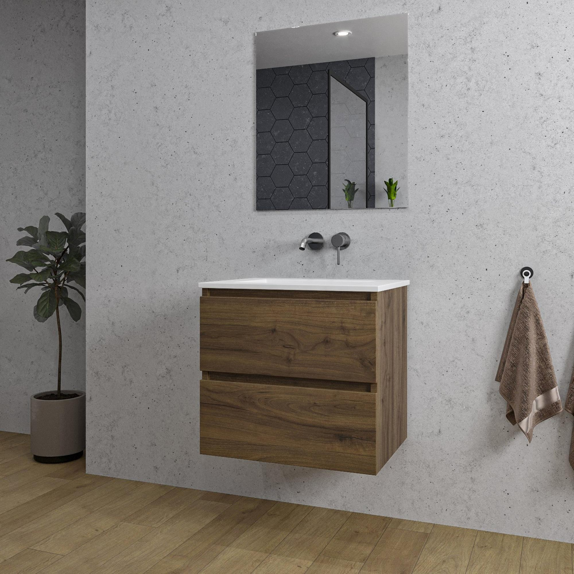Saniclass Chaci Ensemble meuble de salle de bains - 60x46x57cm - lavabo en céramique blanc - 1 vasque - sans trous de robinet - 2 tiroirs - miroir rectangulaire - noyer (bois)