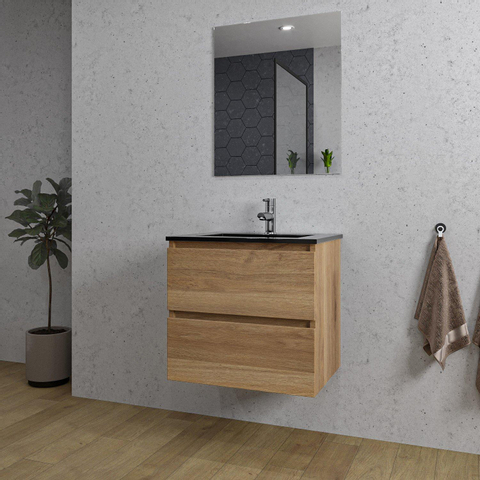 Saniclass Chaci Ensemble meuble de salle de bains - 60x46x57cm - lavabo céramique noir - 1 vasque - 1 trou de robinet - 2 tiroirs - miroir rectangulaire - chêne