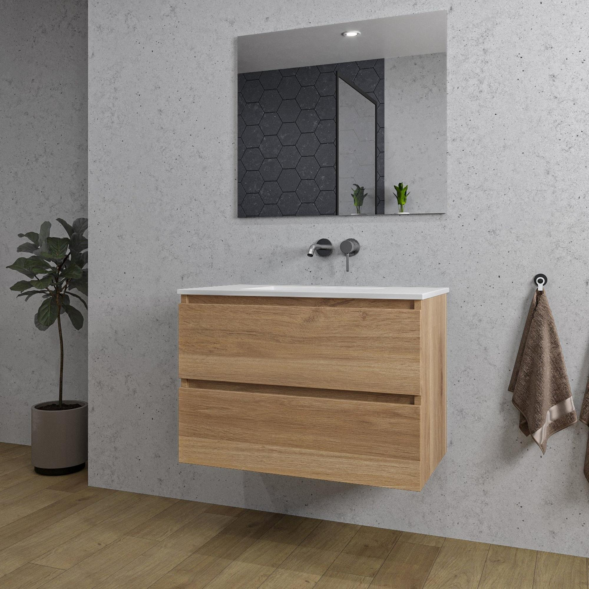 Saniclass Chaci Ensemble meuble de salle de bains - 80x46x55cm - lavabo en céramique blanc - 1 vasque - sans trous de robinetterie - 2 tiroirs - miroir rectangulaire - chêne