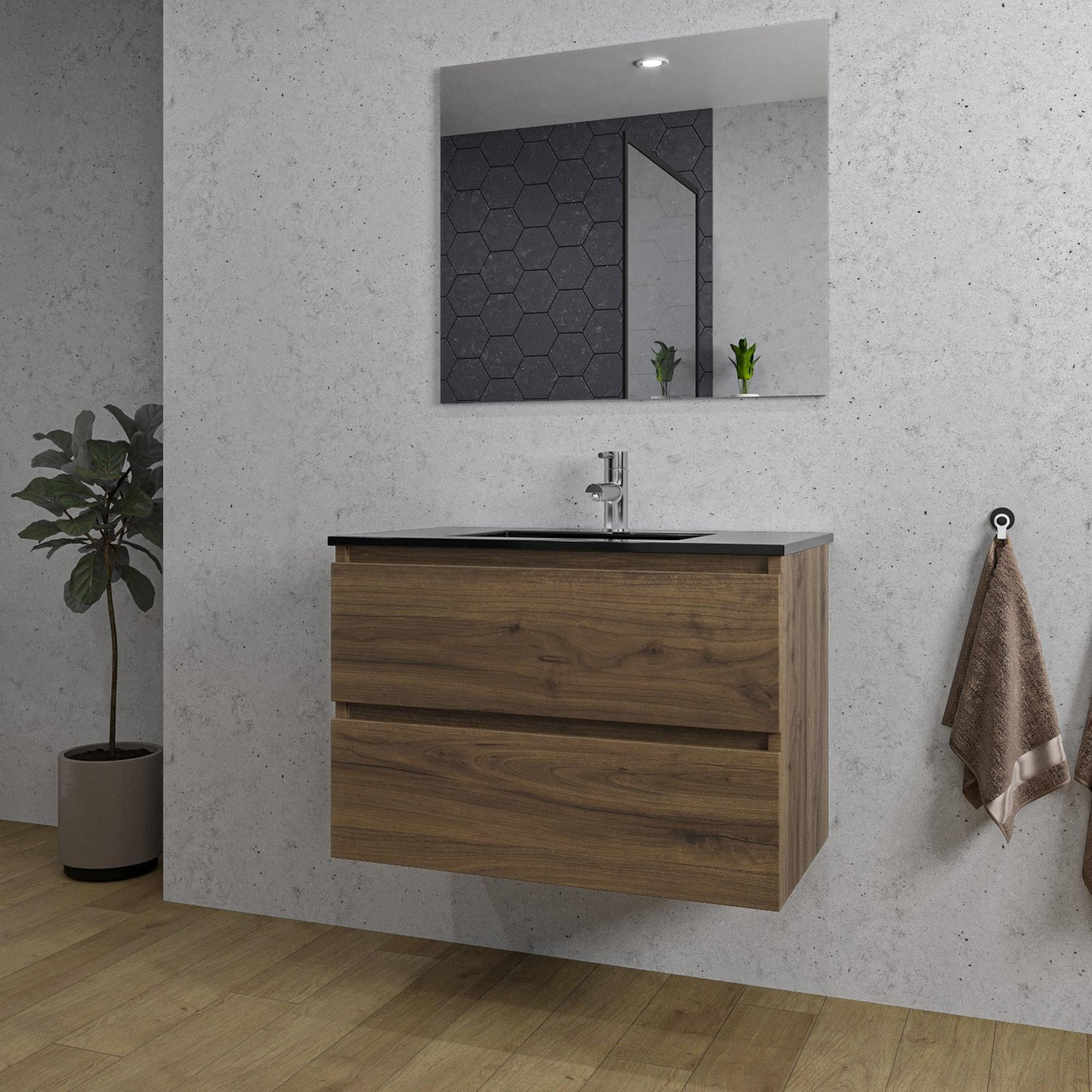 Saniclass Chaci Ensemble meuble de salle de bains - 80x46x55cm - lavabo céramique noir - 1 vasque - 1 trou de robinet - 2 tiroirs - miroir rectangulaire - noyer (bois)