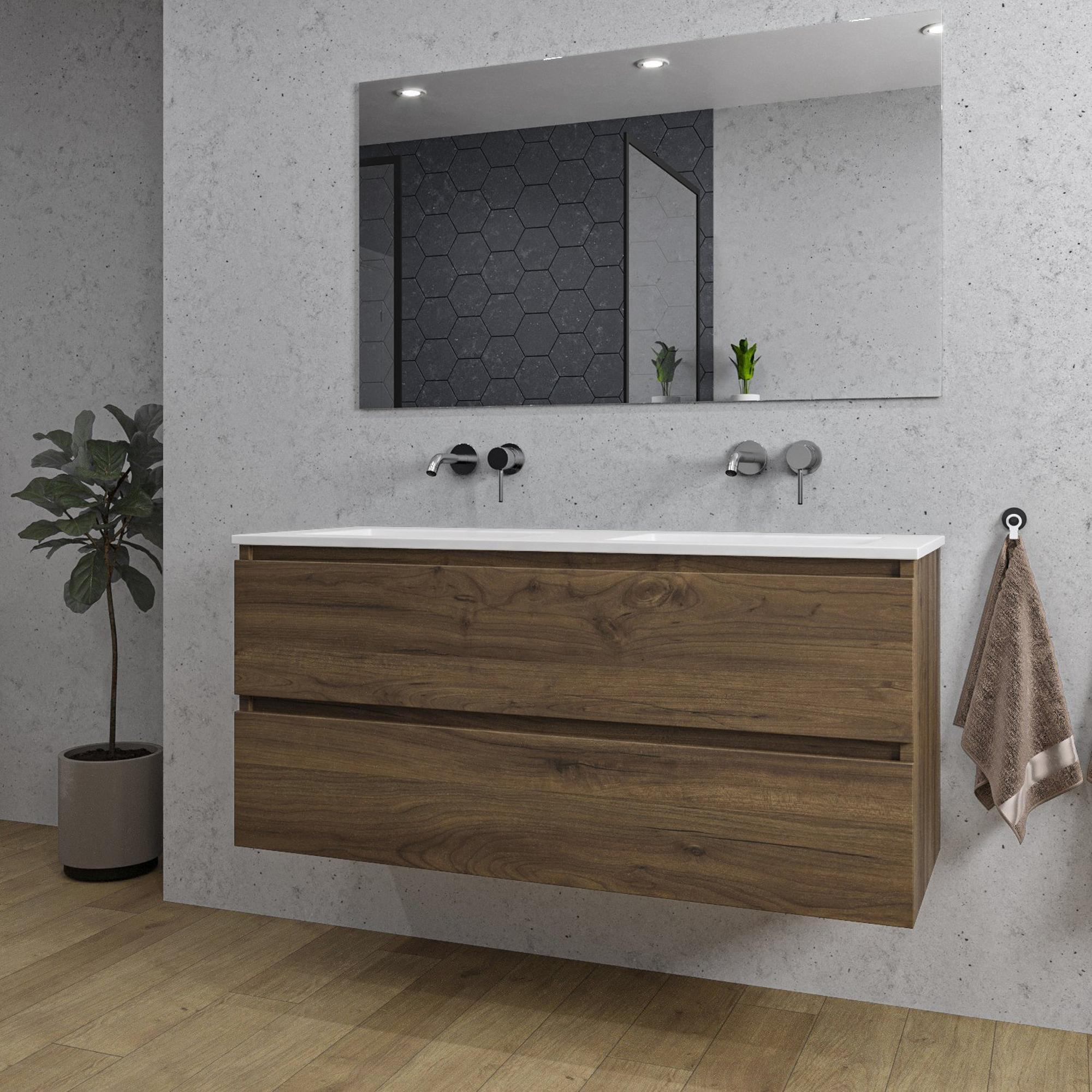 Saniclass Chaci Ensemble meuble de salle de bains - 120x46x57cm - lavabo en céramique blanc - 2 vasques - sans trou de robinet - 2 tiroirs - miroir rectangulaire - noyer (bois)