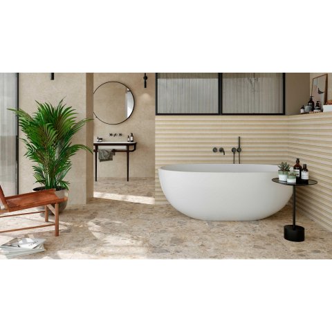 Vous recherchez un carreau discret et intemporel qui donne immédiatement à votre salle de bains une apparence haut de gamme, sans être trop chargé visuellement ? Ce carreau de sol dans une teinte greige chaude combine le meilleur du gris et du beige, ce qui lui permet de s’harmoniser parfaitement aussi bien avec les éléments sanitaires blancs qu’avec des robinets noirs ou en laiton. Grâce au grand format de 60x60, la pièce paraît plus grande et plus calme, idéal pour les salles de bains modernes, les toilettes et buanderies ou un sol posé en continu vers le hall ou la cuisine. La finition mate et le subtil effet pierre naturelle créent une ambiance luxueuse mais néanmoins sobre. Vous rénovez entièrement votre salle de bains ou vous souhaitez simplement remplacer le sol ? Alors c’est un choix judicieux et durable qui restera beau pendant de nombreuses années et dont vous ne vous lasserez pas rapidement.