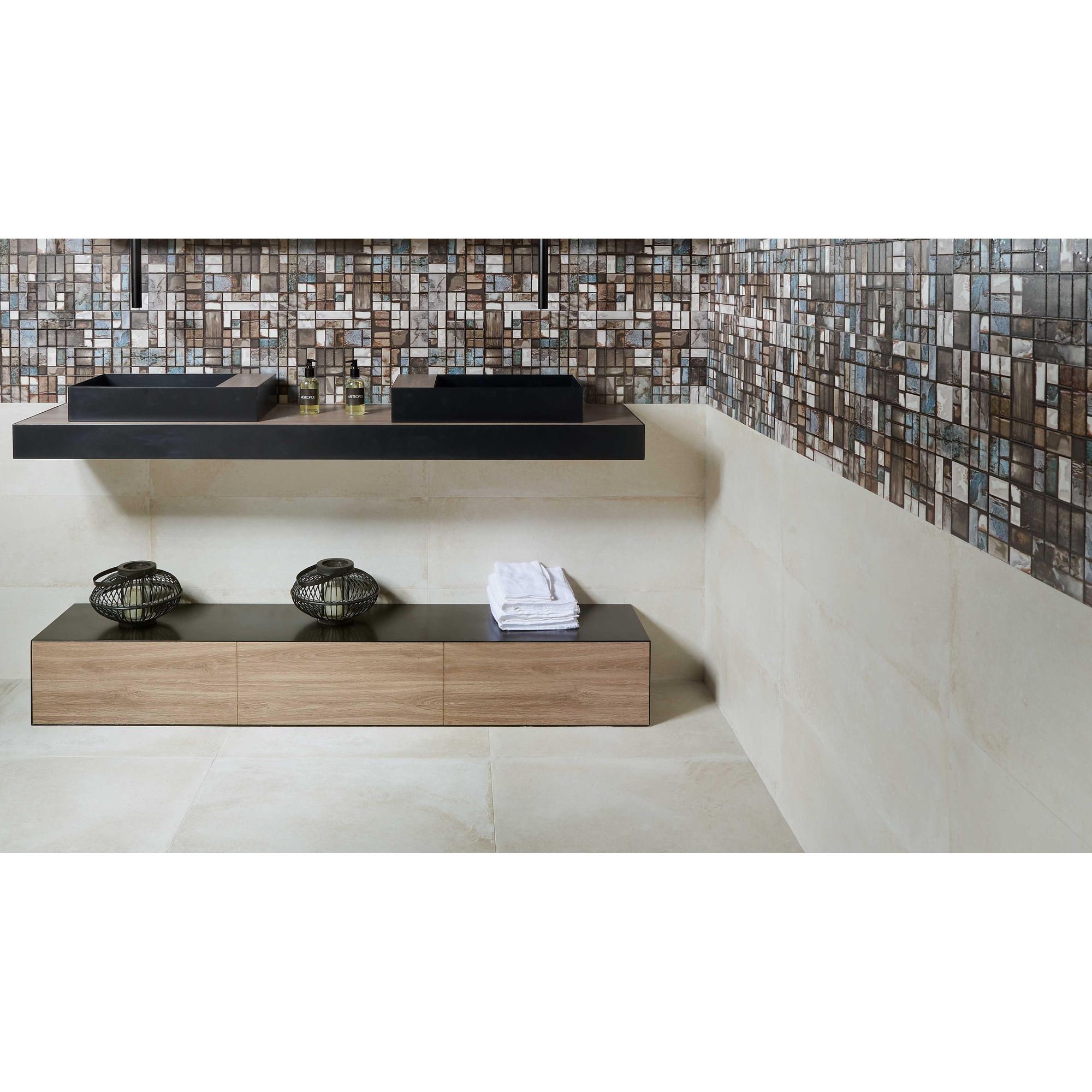 La combinaison d’une couleur beige chaude avec un subtil effet béton et pierre naturelle donne immédiatement à votre mur une apparence luxueuse, sans que cela ne devienne trop chargé. La teinte est suffisamment neutre pour se marier avec pratiquement tous les styles, du sanitaire blanc épuré aux robinets noirs et aux meubles en bois. Grâce à la finition mate, il n’y a pas de reflets gênants de la lumière, ce qui est particulièrement agréable dans les salles de bains avec des spots et de grands miroirs. La série de carreaux est conçue avec une variation dans le dessin, de sorte que chaque mur obtient un aspect vivant et naturel au lieu d’un motif plat. Vous créez ainsi un fond atmosphérique qui met joliment en valeur votre meuble de salle de bains, votre douche ou votre baignoire autoportante.