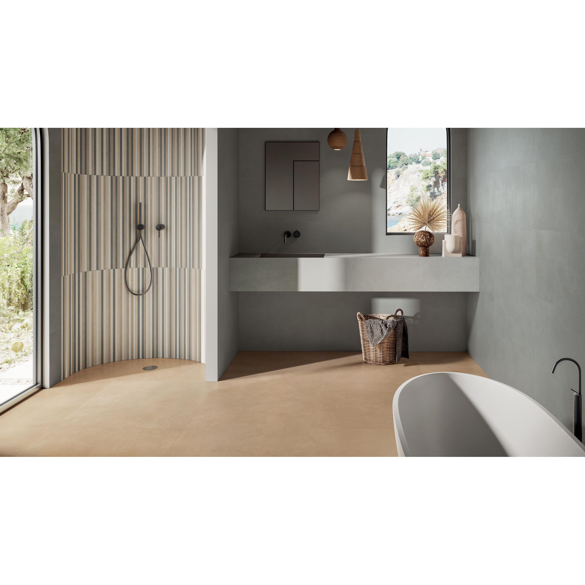 La couleur Cenere est une teinte gris moyen douce avec un subtil aspect béton, qui crée une base moderne et apaisante dans votre intérieur. Dans la salle de bains, cette couleur se marie parfaitement avec des produits sanitaires blancs, des robinets noirs ou gunmetal et des meubles ton bois, mais aussi avec des meubles blancs épurés pour une véritable ambiance bien-être. Comme le carreau présente un aspect uni avec de légères nuances, le sol ne paraît pas chargé, mais au contraire élégant et équilibré. Grâce au format 30x60, vous pouvez allonger visuellement la pièce en posant les carreaux dans le sens de la longueur, ou au contraire la faire paraître plus large en les posant en travers. Cette flexibilité rend le carreau très adapté aussi bien aux petites salles de bains qu’aux espaces généreux.