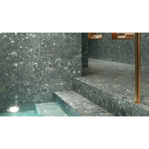 Le look Ceppo dans une teinte de vert douce donne immédiatement plus de caractère à votre salle de bains, sans devenir criard. La structure terrazzo subtile apporte de la profondeur à la surface et dissimule mieux les petites salissures et les éclaboussures d’eau qu’un carrelage uni, ce qui est particulièrement pratique dans un foyer animé. Grâce à la gamme de verts, ce carrelage se marie à merveille avec des matériaux naturels comme les carreaux effet bois, les accents noirs ou la céramique sanitaire blanche. Vous pouvez ainsi créer facilement une combinaison de couleurs harmonieuse qui restera belle pendant des années. Utilisez-le au sol et au mur pour une ambiance d’hôtel luxueuse, ou combinez le sol avec des carreaux muraux clairs et sobres pour un ensemble spacieux.