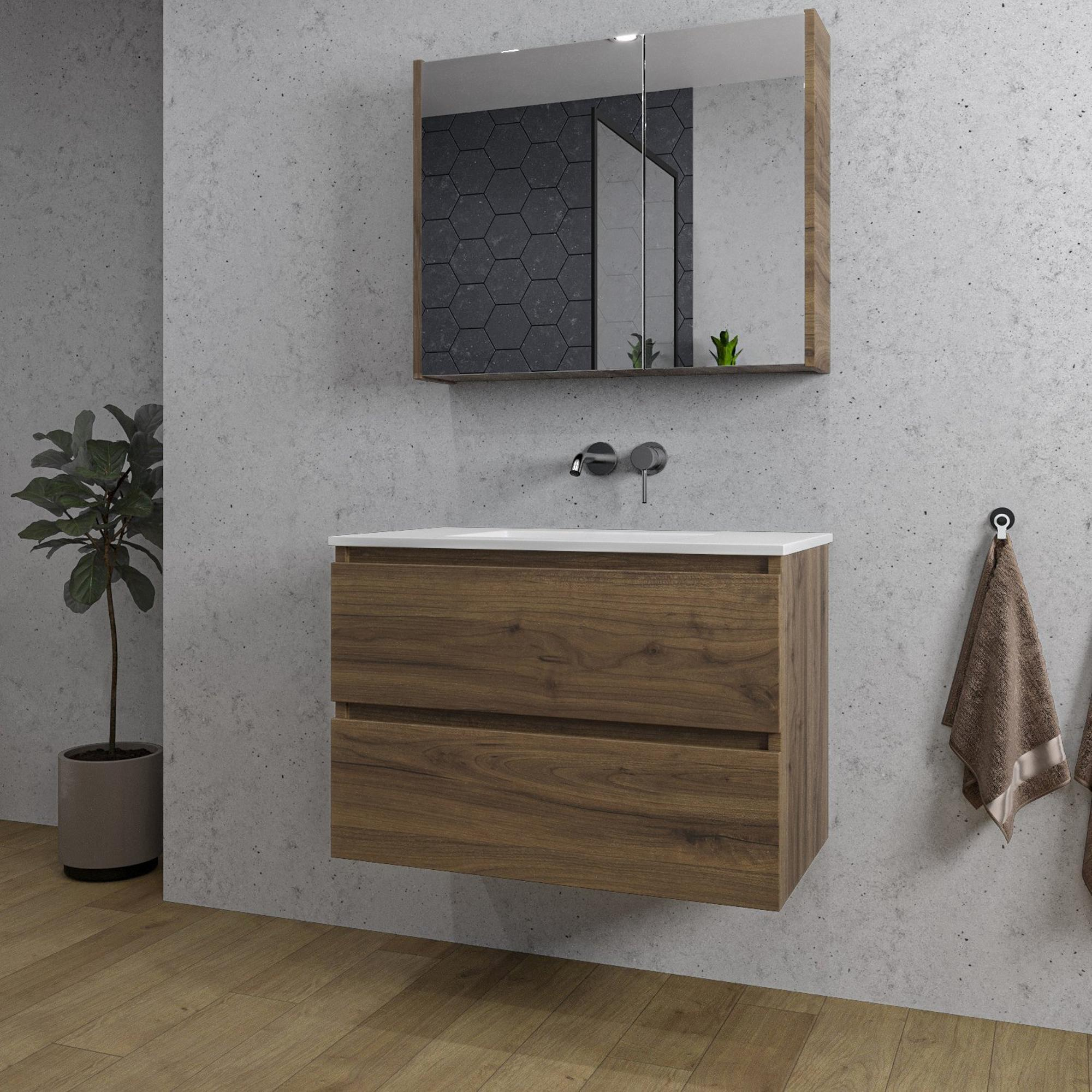 Saniclass Chaci Ensemble meuble de salle de bains - 80x46x55cm - lavabo en céramique blanc - 1 vasque - sans trous de robinet - 2 tiroirs - armoire miroir - noyer (bois)